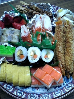 お料理講習会で教えていただいたもの 鰆の押しぬき寿司ご飯の上にのっている物は、鰆・アナゴ(甘い)・卵・エビ・きぬさや・イクラのしょうゆ漬け讃岐の寿司飯の味は少し甘め。とってもおいしかったですよ