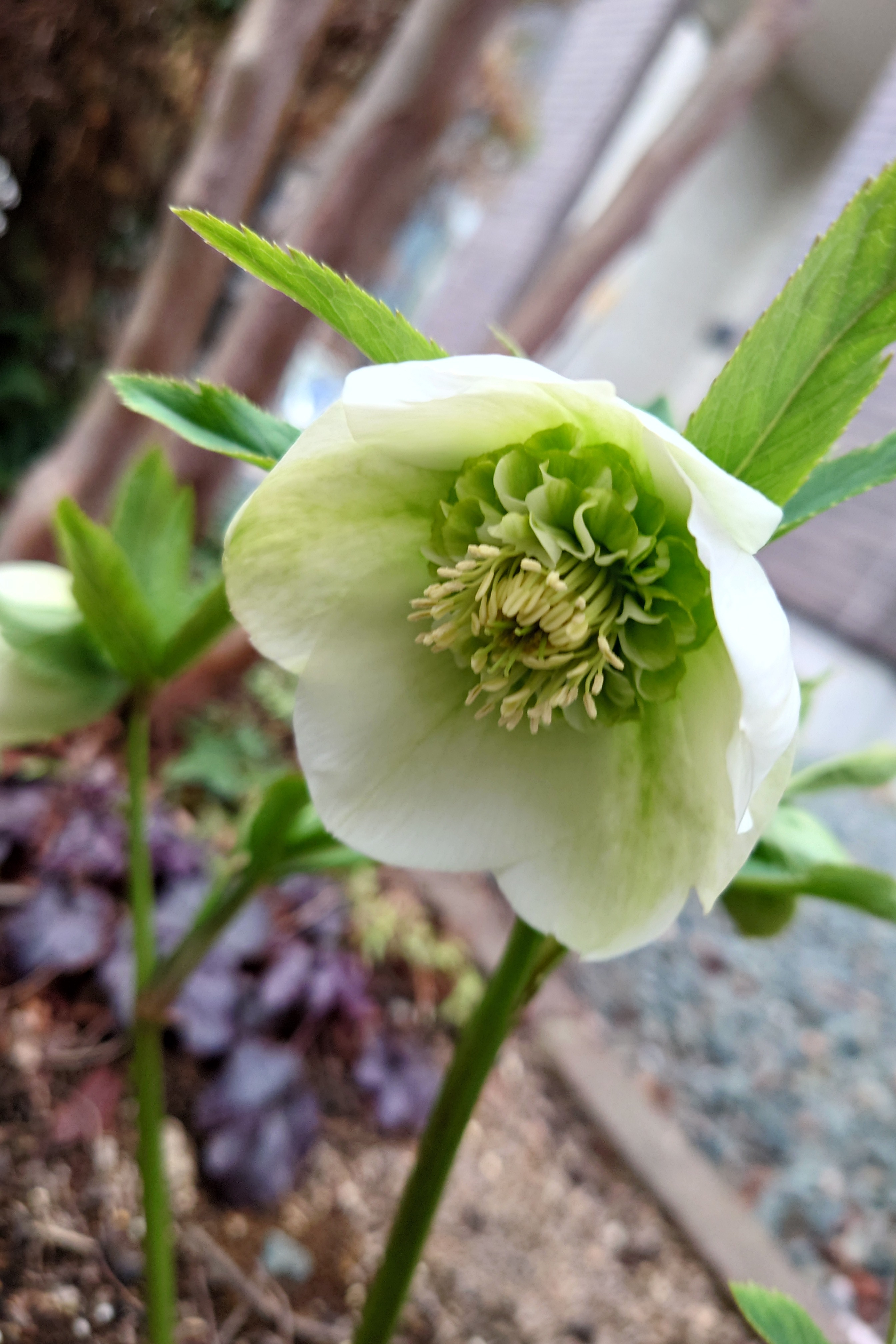 園芸ショップのくじ引きで当てたどんな花が咲くかわからない「ドキドキクリスマスローズ」。去年は1輪しか咲かなかったけど今年は今のところ3輪見えてる。フリフリがめちゃくちゃカワイイ…❤