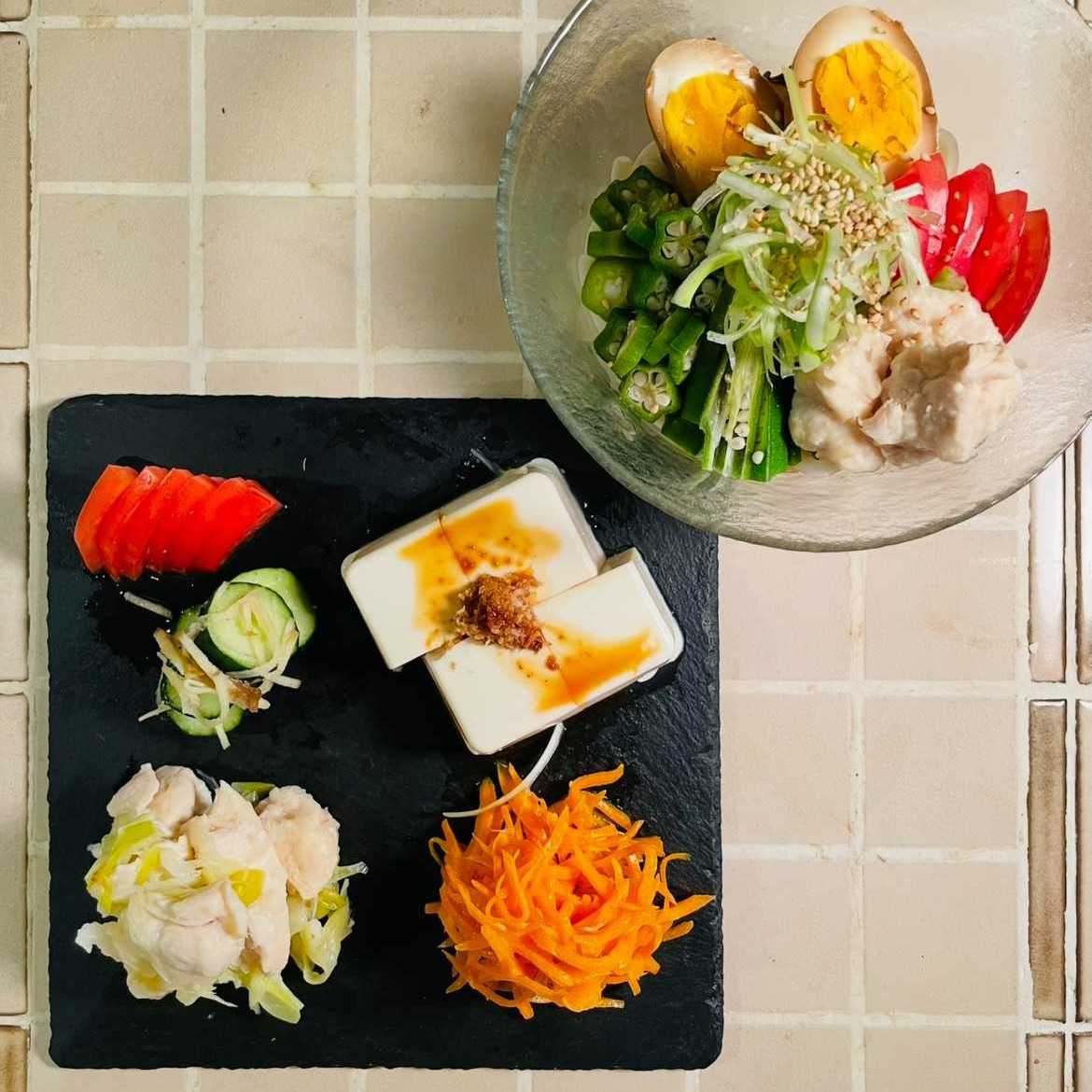 ・前菜盛り(トマト、浅漬けきゅうり、冷奴、キャロットラペ、鶏ささみネギ和え)