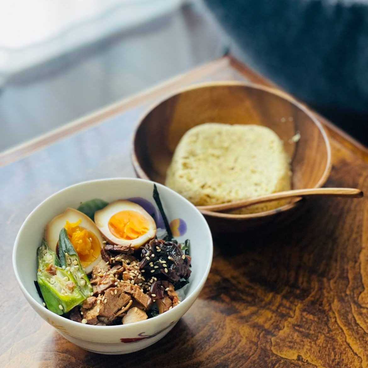 :小丼(味玉・海苔・オクラ・焼豚の端っこ)、レンジオートミール蒸しパン(バナナ・卵など)