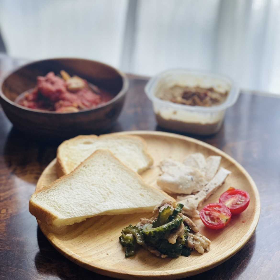 食パン、鶏ハム、ミニトマト、ゴーヤと太切り豚肩ロースの甘辛炒め