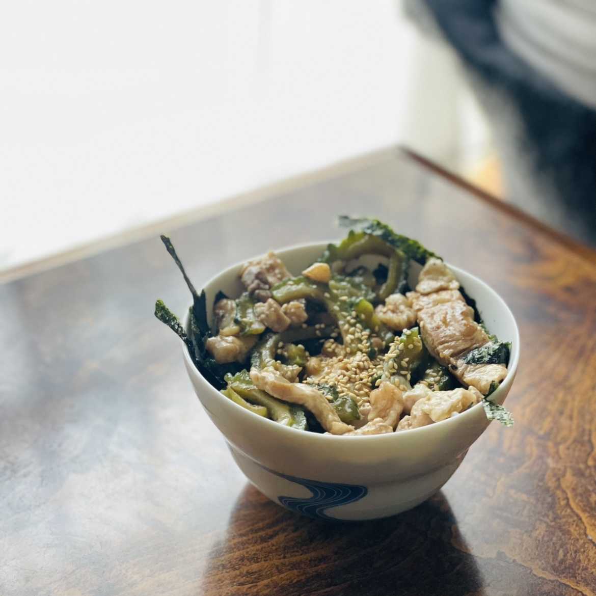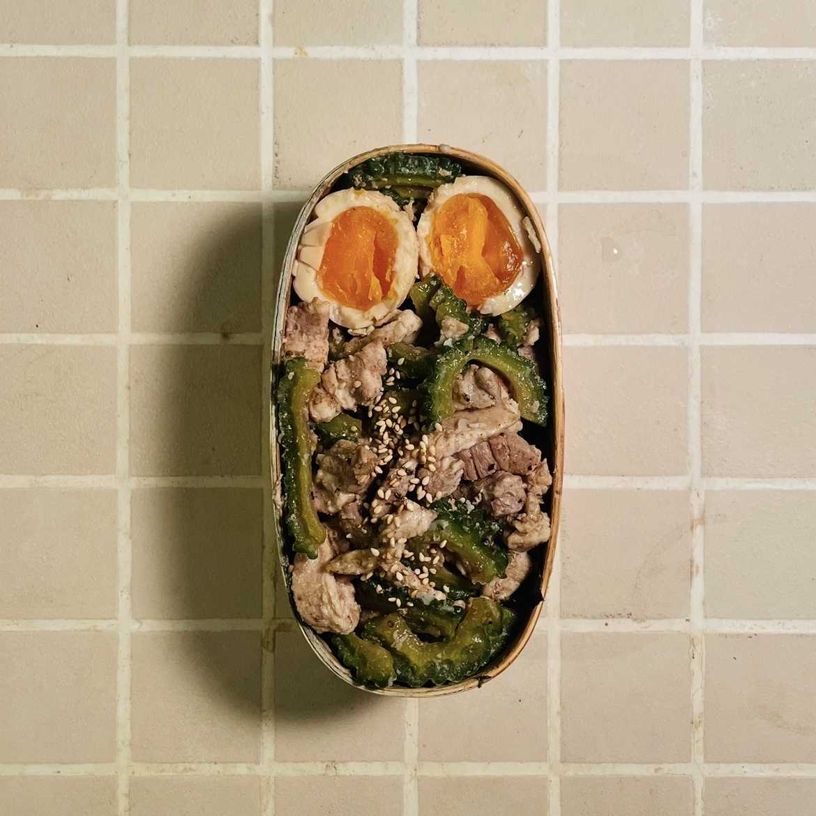 :・ゴーヤと太切り豚肩ロースの甘辛炒め+納豆丼