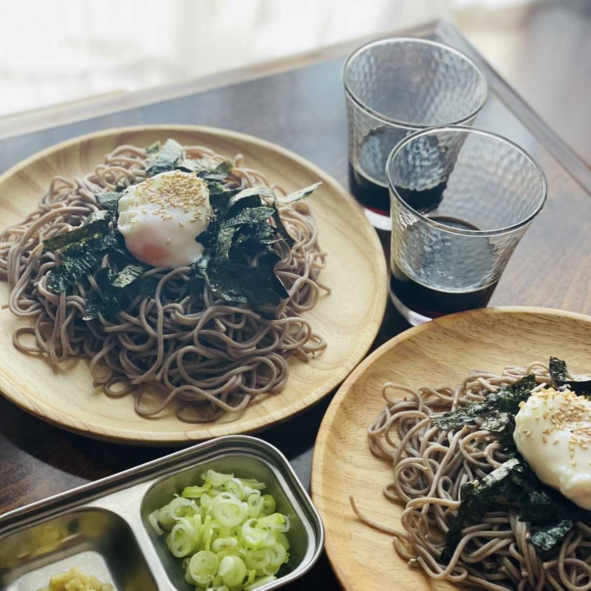 お昼はカロリー調整のため蕎麦。 ただ、そばざるやそば猪口がなく、プレートや100均のグラスで代用…。