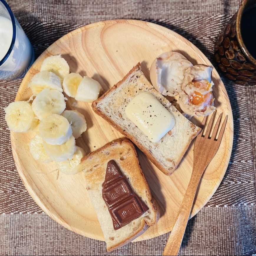 朝:トースト(ライ麦)、チーズ、ブラックチョコレート、バナナ、ご飯、生卵、ヨーグルト