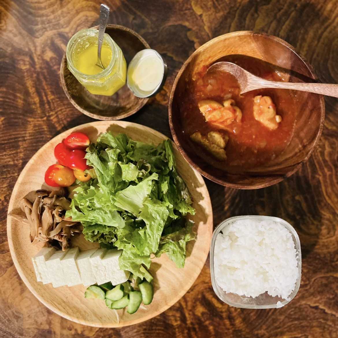夜:サラダ菜、ミニトマト、きのこマリネ、きゅうりの浅漬け、スパイスカレー(鶏もも肉3口)、ご飯少し(写真の半分)