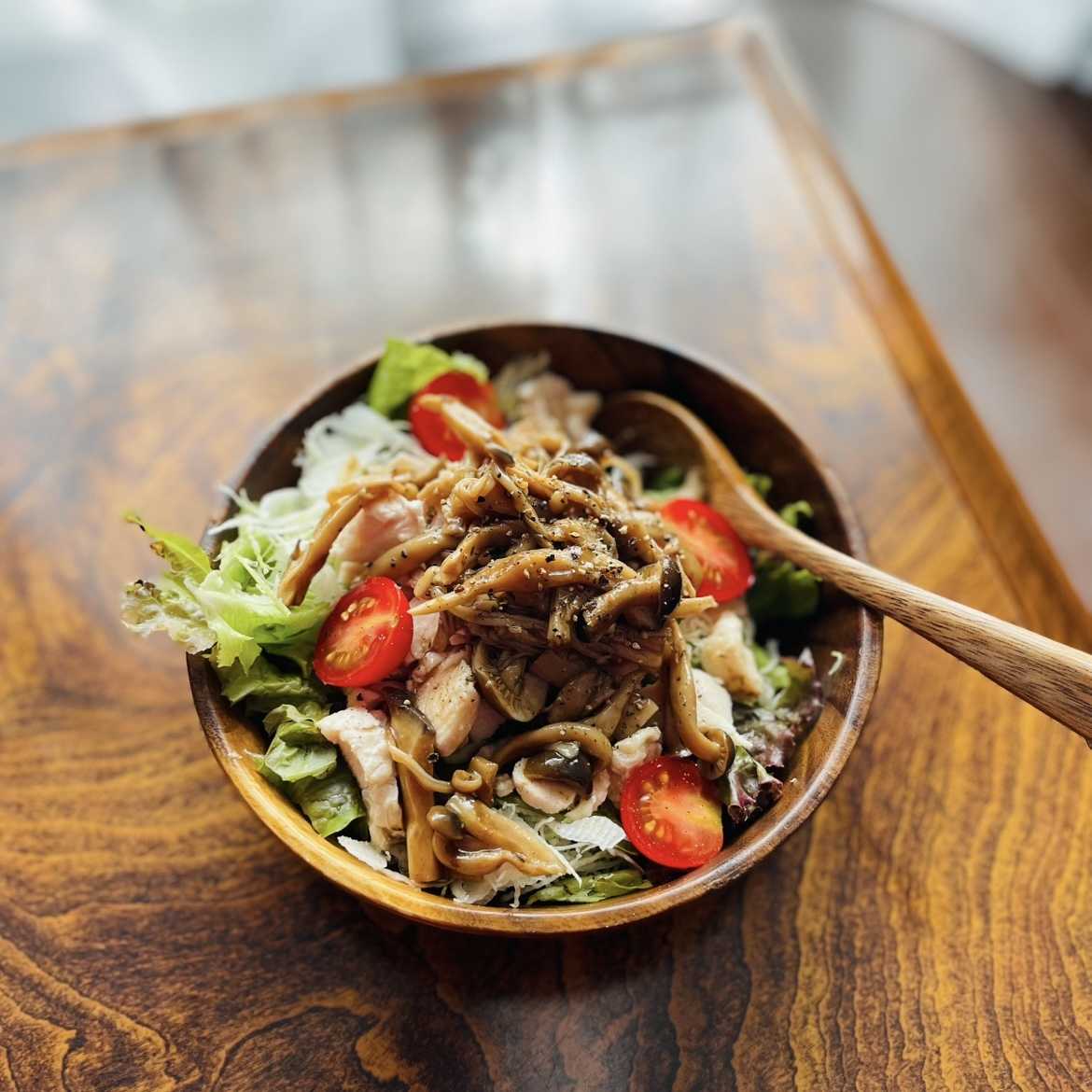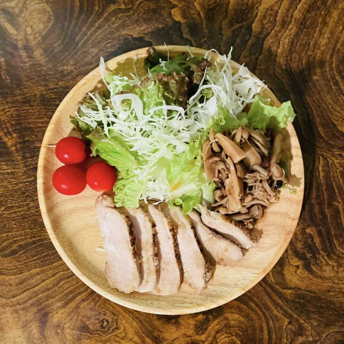 昼:キャベツの千切り、サラダ菜、きのこマリネ、木綿豆腐、鶏ハム