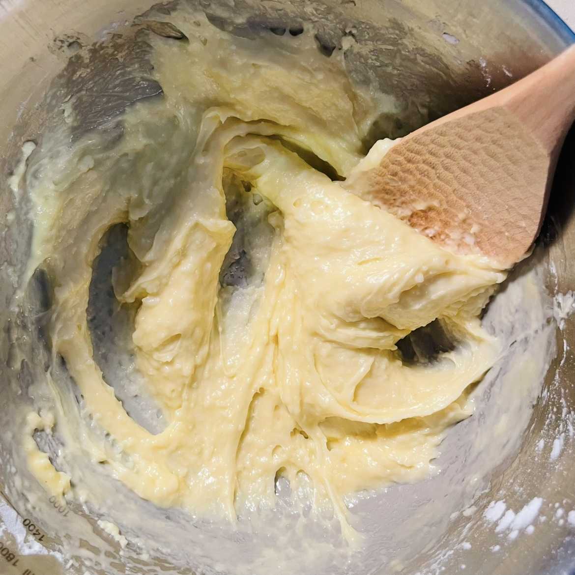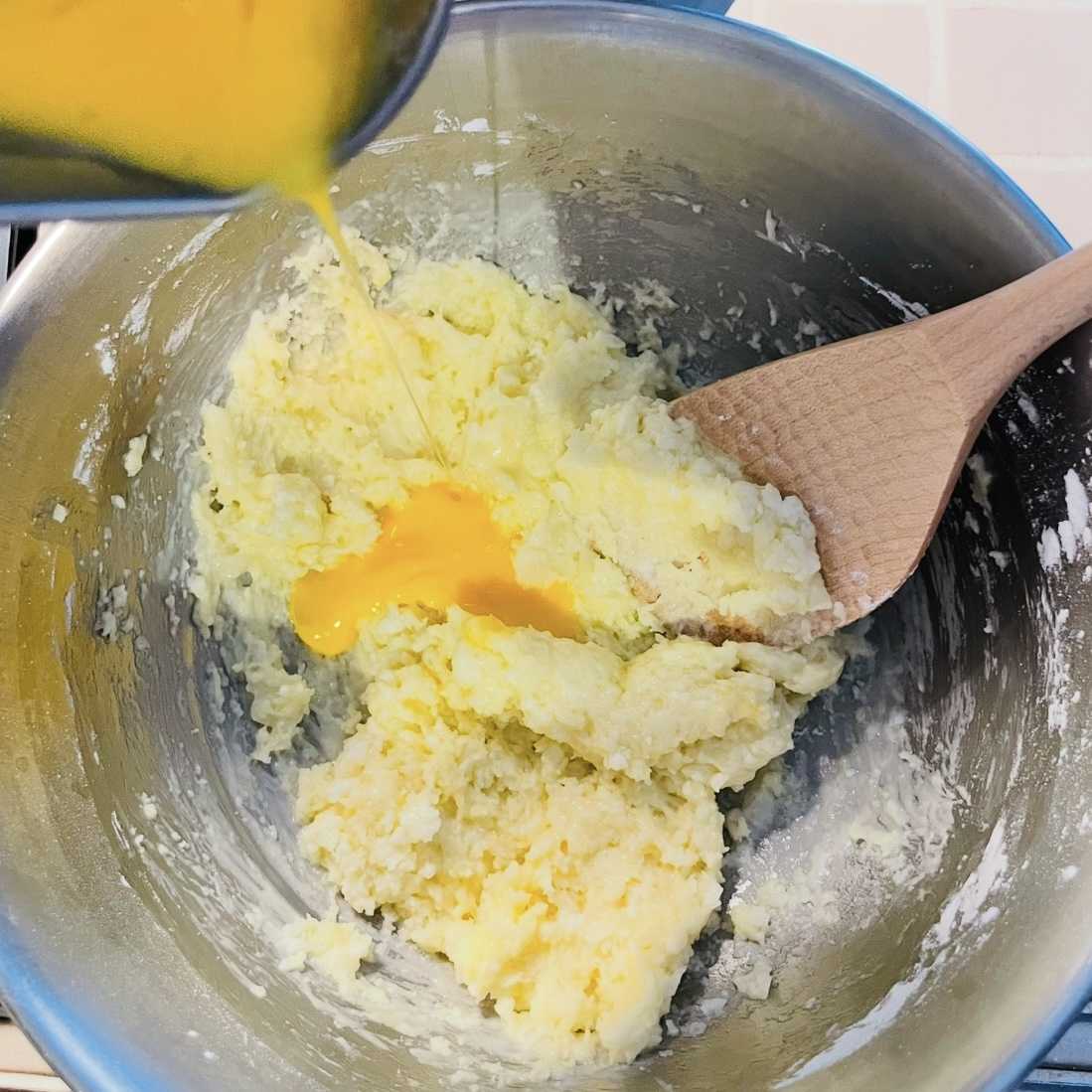 ⑤ 溶き卵を少しずつ加えながら、なめらかになるまで混ぜる。