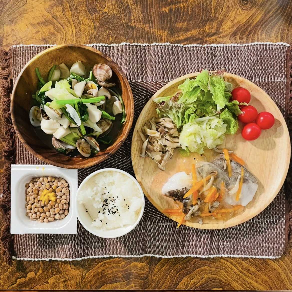 夜:鱈のあんかけ、あさりの酒蒸し、サラダ(レタス、トマト、きのこマリネ、キャベツマリネ)