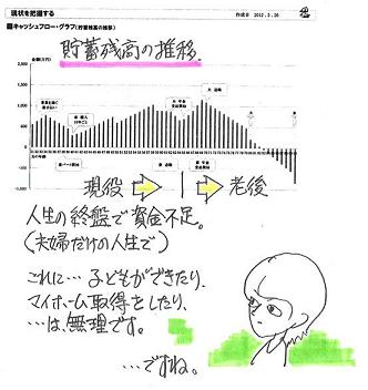 家は早く建てるほどお得?・・という結論を導くための、なんちゃってプランニング資料。保険屋と住宅屋のコラボ資料。(だまされないよーに)早く実物が見たい。保険屋さんが作った、素人だましの なんちゃって資料。真剣に・・生活設計。岩手 一関市 厳美渓 イチノセキシ ゲンビケイがんばろー東北!〇顧問会員のTさん(30代) (相談:生活設計・マイホーム取得)今日・・午前、夫のみが来所。先週・・4/20(金)に夫妻で来所して、ヒアリングを終えています。(行列に並んでいる)・・が、細部を詰めたい・・ということで、来所して改めてキッチリとヒアリング。佐々木FPがヒアリングを行ないました。死亡保障の計算のための質問・・「夫が死んだ場合の妻の働き方」・・で、記入されている金額を見て・・佐々木FP「この・・パートの収入では、 現実的に生活していけませんが・・。」Tさん「現在のようなマトモな収入を得る ような仕事はきつい・・と妻が・・。」夫が死んだ! もういない!私一人で働いて生きていかなきゃ!・・という状況を真剣に想像して、ヒアリングシートを記入してもらう必要があります。でないと、まともな死亡保障必要額を導き出すことができません。現状診断のヒアリング全体では、おかしな記入内容がよくあります。顧問会員のヒアリングシートを佐々木FPが整理整頓した結果、「再ヒアリング!」として返送しています。記入漏れ・・も よくありますが、勘違い記入や意味不明記入などがよくあります。そのようなモノの交通整理が済んで、再ヒアリング!・・ということになります。・夫が死んでも、妻は専業主婦のまま。・老後の生活費が、現役時より多い。・・なんて意味不明記入がよくあります。もっともっと色々なおかしなことに、佐々木FPがチェックを入れて、「再ヒアリング!」を完成させています。子育て中のママだから、色々なことに気がつきます。(・・助かっています)ヒアリング後の私との会話で・・Tさんは住宅会社に奨められて、ソニー生命の人と会った・・ようです。キャッシュフロー表やグラフを作ってもらった・・ようです。簡単に作成された・・そうです。それなりのソフトがある・・ようです。(手間をかけずに資料を作成する)シミュレーションもやってくれた・・ようです。家賃や住宅ローンや諸々考慮して。今すぐ住宅取得した場合、数年後の場合、さらに先の場合、いくつかのパターンで比較してみせて、得られた結論は・・「マイホーム取得は先延ばしするほど損!」具体的な金額で示されて・・Tさん、すっかりその気になった・・ようです。ミッション成功!うまく できています。住宅屋と保険屋のコラボレーション!建築促進できれば、住宅屋はうれしい!受注できれば、保険屋にキックバック?ライフプランニングは、販売促進に使われているのが現実・・です。ただ・・ライフプランニングと言っても、保険屋さんのそれは、簡単にその場でできてしまうなんちゃってプランニング・・ですが。きちんとしたキャッシュフロー表を作るためには、詳しいヒアリングが必要になります。根掘り葉掘り・・の、ヒアリングが。当事務所では・・ヒアリングから現状診断資料作成まで、正味作業日数の平均は、約5日・・です。これが当たり前・・と、考えます。保険屋さんの表やグラフは、簡単すぎるヒアリングから得られた役に立たない資料 ・・です。(簡単ソフトでできる範囲の)人間の一生を表現するのは、そんなに簡単なことではありません。当事務所のヒアリングで、佐々木FPがよくやるような、突っ込んだ質問やダメだしなどは、保険屋さんのヒアリングでは、まったく無い! ・・です。後日・・保険屋さんの作成資料をコピーさせてもらうことになりました。楽しみ・・です。どの程度のことをやっているのか?(手に入れたら、ブログにアップします)言っておきますが・・これまで、保険屋さんが顧客の生活設計をきちんと行なった形跡は、まったく見たことがありません。ソニー生命も、もちろん・・です。彼らにとって、ライフプランニング(もどき)は、商品を販売するためのツールに過ぎません。保険会社も保険販売代理店も、同じこと・・です。 みんな、保険屋さん・・です。Tさんのマイホーム:進行状況 1 家計の現状診断・問題点把握 2 ライフプランニング(生活設計) 3 資金・ローンの目安を立てる 4 土地探し・土地売買契約 5 展示場ほか見学 6 事前手続き・住宅プラン検討・作製 7 住宅会社・数社が提案競争 8 業者決定・請負契約 ・事前手続き 9 地鎮祭 着工 10 上棟~ 11 完成・入居 12 住宅ローン返済開始今日の佐々木FP〇メール顧問会員のHさん(30代) (相談:ライフプランニング)現状診断資料の作成作業。順調に作業が進み・・今日、「再ヒアリング」として送りました!【 行列のできるFP事務所 】 資料作成の順番を待っている顧問会員の行列です。 お待たせしています。大変申しわけありません!1 Kさん(40代):現状診断 回答待ち。(8/16着)2 I さん(30代)