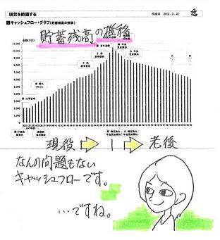 しっかり見直して・・やっと、なんとかなりそうな人生・・に。真剣に生活設計。岩手 ゆこたんの森がんばろー東北!〇メール顧問会員のYさん(30代) (相談:ライフプランニング)3/26、現状診断 終了! 家族は現在・・夫婦のみ。 夫(30代):会社員。これから経営者に。 妻(20代):パート? 賃貸住宅住まい。 〇預貯金 夫婦合計 : 460万円 〇借金 妻(奨学金):残債 253万円 〇生命保険料 月額、年額、・・とも、0円! (・・まったく加入していない) 診断結果は・・このまま夫婦だけだったとしても、人生が・・成り立ちません。子どもができたりしたら・・、もっと・・ひどいことになるし、このままでは住宅取得もあり得ません。メールをいただきました。 ※は、私の声。おはようございます。〇〇のYです。記事を読ませていただきました。軽く五千万円を超えるのですね。 ※「住居費総額」のお話・・。戸建に住んだことがなかったのでいろんな経費がかかるんだなぁと改めて知りました。 ※住んでいる人でも・・実は、 こんなこと知りません。ちなみにブログに出会う前は完全にマンション派でした(笑) ※数十年後のマンションは、 処理に困る粗大ゴミ。 マンションライフをしたいなら、 買うな!借りろ! マンションは所有しない! 所有している人は、まともな 価格で売れる内に売れ! それから・・、投資用に・・と ワンルームマンションを、 買ってはいけない。 (だまされるな!) 将来・・手に負えない 粗大ゴミを抱えることになる。いろいろCF表を書き換えてみました。まず住居費ですが、ヒアリングのとき住居費の中に妻が仕事で使っていた駐車場代が含まれていました。もぅ仕事をやめて解約するので66660円になります。二年に一度更新料がかかるので6.7万円ですね。ちなみに我が家くらいの収入だといくらくらいの家賃が妥当になりますか? ※収入で決まるわけではない。 全体の収支バランスを、 キャッシュフロー表で眺めて、 判断しましょう。収入ですが、定期昇給はないのですが少なくとも今の水準は維持できると思います。妻の収入も空白5年分は埋まります。なので夫60歳までは〇〇〇万円にして大丈夫です。レジャー費ですが車そのものにかかる分は会社の経費になるので(通勤に使うから)純粋に遊びに使う分だけになると思います。なので〇〇万円になります。会社の経費になりそうなものはちょいちょい...家族経営の特権ということで(^^; ※そのへんは、よくある おいしい特権・・です。まぁ税理士さんがいるので行過ぎることはないと思います。だいぶ当初の表より改善できたと思いますがいかがですか? ※メチャクチャ・・改善! できました。ただ未来のことは『多分...と思います』の範疇を超えないので ※だれでも同じ・・です。 「絶対確実な将来♪」 なんて、どこにもない。何ともいえないですね...よろしくお願いします。夫の収入、妻の収入、住居費や車費の支出、それぞれをしっかり見直した結果、以下のようなグラフになりました。まったく、別の人生・・です。これなら、新たな計画もできそうです。子どもの誕生やマイホーム取得、などなど・・大丈夫そうです。今日の武田FP〇セミナー 午後1時から日建学院でセミナー。 資格試験の勉強をしている (FPや宅建) 人たちが対象です。 「生命保険には入るな!」 ・・のような話に、皆さん唖然・・。 試験には絶対出ない話題で、 1時間半・・しゃべりまくり。 (時間が足りなかった・・) 私のセミナーは、FP試験には まったく役に立ちません。 試験のことは、どうでもいい。 受験に必要な、 決まりきったことを、ひたすら 暗記すれば勝手に受かる。 私の話は・・そうではなくて、 ナマの人生設計のために、 おおいに役立ちます。 真のライフプランニングのための、 セミナー講演・・です。 試験のため・・ではなく、 それぞれの人生のため・・のセミナー。今日の佐々木FP〇メール顧問会員のKさん(20代) (相談:ライフプランニング)現状診断資料の作成作業。明日で整理整頓が終了できそうです。【 行列のできるFP事務所 】 資料作成の順番を待っている顧問会員の行列です。 お待たせしています。大変申しわけありません!1 Tさん(30代):現状診断 回答待ち。(5/20着)2 Kさん(40代):現状診断 回答待ち。(8/16着)3 I さん(30代):現状診断 回答待ち。(10/8着)4 Aさん(30代):現状診断 回答待ち。(11/5着)5 Oさん(30代):現状診断 回答待ち。(11/14着)6 Tさん(30代):現状診断 回答待ち。(12/13着)7 Nさん(30代):現状診断 回答待ち。(1/25着)8 Kさん(20代):現状診断 今日の作業。(2/1着)9 Fさん(30代):現状診断 2/13 シート到着。10 I さん(30代):現状診断 2/23 シート到着。11 Hさん(30代):現状診断 2/24 シート到着。12 Mさん(40代):シミュレーション 3/1 依頼着。13 Mさん(30代):現状診断 3/5 シート到着。14 Tさん(40代):現状診断 3/5 シート到着。15 Kさん(50代):現状診断 3/5 ヒアリング。16 Kさん(40代):現状診断 3/6 シート到着。17 Kさん(30代):現状診断 3/10 シート到着。 資料完成まで、待ち日数を含めて約2ヶ月前後です。 