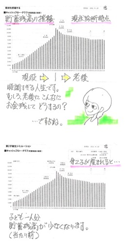 それぞれの人生 ・・です。自分の家を建てるのは、一般的には・・自分です。自分の頭で考える・・生活設計。〇メール顧問会員のAさん(30代) (相談:ライフプランニング)11/22(木)、シミュレーション資料が完成!メール添付で送りました。マイホーム取得のシミュレーション・・です。2通り、作成しています。住宅ローンをすなおに払って行った場合と、積極的に繰上返済した場合。現状診断時点(9/20)のキャッシュフローは、以下のようになっていました。(上)(夫婦に子供1人)いっしょに・・第2子誕生の場合も、シミュレーションしました。(下)今回は、マイホームを取得した場合人生がどうなるか?・・を、シミュレーションしました。大都会なので、土地代が高く、住宅取得の総額はすごい金額になります。当然・・住宅ローンの金額もものすごい額!・・です。盛岡のような田舎では考えられないような金額!・・です。資料を作成しながら・・この借金額に佐々木FPもブルッ!!寒気を催した・・ようです。(佐々木家も住宅ローン返済中)現役中の完済が可能な家計です。マイホームを今・・取得するべきか?どうするべきか?・・のような質問を受けましたが、Aさんの表現が少々分かりにくかったので、指摘したら・・メールをいただきました。武田様 お忙しいところ早速のコメントを頂きどうもありがとうございます。 仰るとおりです。「頭の中も、発する言葉も、 できるだけシンプルに、 分かりやすく。 簡単なことを簡単に、 難しいことも簡単に、 捉えたり話したりする。」武田さんへの質問でも、仕事でも(笑)、気をつけたいと思います。 シンプルに言うと・・仰るとおりで「将来仕事等で遠方に転勤 する可能性があっても、 今家を建てていいか?」ということになります。 私が今思っているところを申しますと・・家を建てた以上は長く住みたいから、自分自身の心の中でこの地域に長く住むんだ!、とならない限り、家を建てるのはやめたほうがよい、と思っています。 武田さんはどのように思われますか?Aさんの家を建てるのは、(武田ではなく)・・Aさんです。「自分自身の心の中で この地域に長く住むんだ!、 とならない限り、 家を建てるのはやめたほうがよい」強い思いがあるようです。で・・あれば、今はやめた方がいいと思います。ただし、家族の意向もきちんと確認した上で・・。A家のキャッシュフローなら、いつでもマイホーム取得が可能です。マイホーム取得をするかしないか?するなら・・いつ実行するか?・・は、それぞれがマイホームに何を求めるか?に、よると思います。子供の成長をはぐくむための巣まい(住まい)・・なんてことがよく言われて、子供たちがまだ小さいタイミングで住宅取得をするケースが一般的には多い・・ようです。大手メーカーが消費税がらみで盛んに宣伝広告しています。増税後に建てるとこんなに不利なことになるよ!・・と訴えています。まともに信用しないよーに。私に言わせれば・・増税後に建てる場合の不利よりも、大手メーカーで建てる場合の不利が、数倍も大きい!・・んです。イメージで言えば・・増税後に建てれば200万円の損。大手メーカーで建てれば600万円の損。おおげさではなく、現実・・です。建築価格はそれぞれ違うのが当たり前です。間取り・サイズ・性能・設備などが同じでも、価格が違うのが当たり前です。何の差か?経費の差!・・です。人件費・広告宣伝費がかかるところは、当然高い!・・です。(当たり前)このことは大手に限りません。地方の住宅会社でも・・ひんぱんにチラシを入れる会社、住宅展示場を抱える会社、営業マンの数が多い会社、こういう会社も、大手とほぼ同様です。真剣に他社を検討しないで建てた入居者は、すごく高い買い物をしたことなんて知らないので・・営業マンや会社の親切な対応に・・「非常に満足しています。 〇〇ホームで建ててよかった・」なんて、感想を漏らします。数百万円も損をしていることに気づかずに・・おバカさん・・です。 (失礼!)初期時点で業者を決定してはいけない。契約直前まで・・きちんと、複数の住宅会社を比較検討しましょう。《 質問希望? 》 まずブログ右上の「キーワード検索」を。「キーワード検索」に言葉 ⇒ 「このブログ内」 ⇒ 「検索」。又は右帯の記事「家計の常識を疑え!」等を読んで下さい。《 顧問会員希望? 》 「顧問会員って何?」で支援内容や当事務所との関係を確認の上、右記へ fpst@axel.ocn.ne.jp