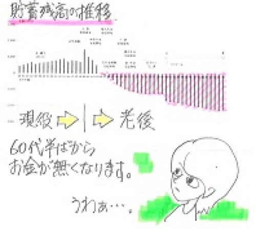 『生命保険の必要額は、 時間の経過とともに減る』・・ことを知らない人が多い。知らないままだと、保険屋さんのやりたい放題で、生涯・・お金をたれ流します。数百万円とか1千数百万円とか・・の大きな金額レベルで。自分の頭で考える ・・生活設計。 たいきん・・たれ流す・・?〇メール顧問会員のKさん(30代) (相談:ライフプランニング)シミュレーション資料作成作業が昨日・・12/5(水)、ついに終了。・マイホーム取得・第2子誕生・住宅ローン繰上返済・・を、それぞれ行なった場合の人生シミュレーションをメール添付で送りました。メールをいただきました。 ※は、私の声。エフピーステーション武田様、佐々木様こんばんは ※昨夜のメールのようです。 当事務所のメールは、 業務時間内でしか 見ることができません。 休日や夜中や早朝に いただいたメールは、 業務が始まるAM10:00 前後に初めて確認できます。〇〇のKですいつもお世話になりありがとうございますブログでシミュレーションの完成しメール添付しましたと拝見しましたがまだメールが届いておりません。申し訳ありませんが、確認をお願いいたします ※ ??? ???また、メールが・・。武田様 佐々木様 おはようございます ※今朝のメールのようです。 昨夜のメールといっしょに 見ました。シミュレーション、届いていました ※ ホッ。 (^^ゞちゃんとかくにんもせず、本当に申し訳ありません 迷惑メールのボックスの方にはいっていて 普段は迷惑メールのボックスはほとんど確認しないものですから 確認が遅れました 私の手落ちで、迷惑、お手数をおかけし申し訳ありません ブログで、第2子のシミュレーションで10年くらいピンチということで、ドキドキしていますが、 一週間程、私の実家に息子をつれて遊びにきていましたので、今日、我が家に帰りましたら、じっくりみさせていだだきます よろしくご指導お願いいたします とり急ぎ、ご連絡まで ※実は・・ 今回のKさんからのメールも、 2つともゴミ箱・・じゃなくって、 「迷惑メール」の方に 入っていました。 時々、まともなメールが ゴミ箱・・じゃなくって、 「迷惑メール」に 紛れ込んでいます。 なので・・私は毎日、 ゴミ箱あさり・・じゃなくって、 「迷惑メール」ボックス? のチェックが欠かせません。 (^^ゞなお、K家の生命保険の必要性について、コメントしておきます。赤ちゃん1人の時点では、夫婦ともに生命保険は不要!・・でした。マイホーム取得後も、夫婦ともに生命保険は不要!・・でした。が・・、第2子が誕生すると、事態は急変します。妻はもちろん、現在も将来も不要ですが、夫には、必要額が発生しました。現時点:2,048万円10年後: 751万円・・ということなので、第2子が誕生した時点で、約2千万円の保障が必要です。必要額は徐々に減っていき、40代半ばでゼロになります。 縦軸が保障金額、横軸が年齢。 黄色の部分が加入中の生命保険。 60歳の定年までの「手厚い」保障。 (かなり無駄にお金をたれ流す) 実際に必要なのは赤い部分。 Kさんの場合は12年程度で不要に・・。ここ! 大切です!仮に死亡保障が必要でも、20年も30年も必要なことは、基本的に無い!・・ということです。だいたいのケースは、数年で不要になる・・か、十数年で不要になります。必要額は、かなりの急角度で減っていく ・・ということを知っておいてください。(非常に大切な知識です)保険屋さんが奨める・・60歳、65歳までの死亡保障が必要な人は、普通はいません。『保険加入=お金を失うこと!』なので、加入するとしても、失うお金をできるだけ最小限にしたいところ・・です。だとすれば・・・抱き合わせの加入・特約のてんこ盛りなどはいっさい行わないことです。(保険屋さんにだまされないこと)将来に向けて保障額が減る、その通りの形(三角形)の保険のみ!・・に加入すれば、最も経済的です。捨てるお金が最少で済みます。 ※経済的な三角形の保険 =収入保障保険 複数の保険会社を、 徹底的に比較検討したい。 シンプルに、一番 保険料が安いところを選ぶ。今日の佐々木FP〇メール顧問会員のOさん(40代) (相談:ライフプランニング)現状診断資料作成作業。明日・・12/7(金)に完成!・・か? といったところです。お楽しみに・・。【 行列のできるFP事務所 】 資料作成の順番を待っている顧問会員の行列です。 お待たせしています。大変申しわけありません! 着手から完成まで一家族当たり平均5日です。 「回答待ち」の人は、個別の事情で長引いています。1 Nさん(30代):現状診断 回答待ち。(7/26着)2 Hさん(30代):現状診断 回答戻る。(8/18着)3 Nさん(30代):現状診断 回答待ち。(9/10着)4 I さん(50代):現状診断 回答待ち。(9/11着)5 Oさん(40代):現状診断 今日の作業。(9/28着)6 I さん(40代):現状診断 回答待ち。(9/29着)7 Kさん(40代):現状診断 回答待ち。(10/5着)8 I さん(50代):現状診断 回答待ち。(10/17着)9 Sさん(30代):現状診断 10/20 シート到着。10 Mさん(40代):シミュレーション10/29依頼着。11 Mさん(30