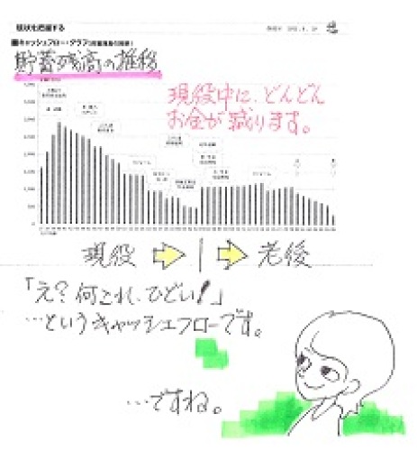 もしかしたら、安心したらダメなレベルでしょうか?もしかしなくても、安心したらダメなレベル・・です。(^^ゞ自分の頭で考える・・生活設計。〇メール顧問会員のHさん(30代) (相談:ライフプランニング)昨日・・9/20(金)、現状診断が終了しました。メール添付で送りました。かなり特異なキャッシュフローになりました。数年後から(現役中から)、グングンとお金が減っていきます。普通のキャッシュフローでは、定年退職時に向けて貯蓄残高が増えていき、老後は徐々に減っていきます。(当たり前)メールをいただきました。 ※は、私の声。武田様 佐々木様お世話になっております。〇〇市のHです。現状診断!!ありがとうございます!実は、待ちに待ってちょっと熱も冷めかかっていましたが (;^^)じっくり読み込みたいと思います。内容ぱっと見ても理解が難しいですね・・またお電話させて頂くかもしれません。 ※面談で直接説明ができない のが、残念です。 東北観光がてら・・盛岡に 来てもらえれば、 理解が深まるんですが・・。住宅ローンの一括返済もこのままだと 厳しいようですね。厳しい赤字結果を覚悟していたのですが、私が仕事を何とかなるかも?程度で済んでとりあえず一安心(?!)しています。 ※ はあ・・?(もしかしたら、安心したら ダメなレベルでしょうか?) ※ひどいレベル、ひどいグラフ、 ・・です。 このグラフを見て、 「安心♪」とか「よかった♪」とかは、 普通・・ありえない。 このグラフを見たら 不安になる・・のが、普通の感性。まずは取り急ぎ御礼申し上げます。ありがとうございます!フルタイムの共稼ぎのころの家計支出も多めですが、(これは一般的なことで、 かまいませんが・・)数年後、妻が仕事を辞めた後の家計支出も多めのままです。さらに教育費の支出がかさむ時期です。当然に貯蓄は急激に減っていきます。現役時代から急激に貯蓄が減っていく・・という危機的な状況になってしまいます。フルタイムの共稼ぎの一方である妻が、以後・・仕事をしないのであれば、家計支出も大幅ダウンしないと、このような悲惨で危機的なキャッシュフローになります。(当たり前)大幅に生活レベルをダウン!するのが不可能なら、妻は完全に専業主婦になるのではなく、ある程度・・働く必要があります。(当たり前)下のグラフは、一般的なキャッシュフローの実例・・です。2013/05/16・・に現状診断が終了した、メール顧問会員のSさん(30代)の、キャッシュフローグラフ・・です。定年退職時に向けて増えていき、(教育費がかかる時期だけ停滞)老後は徐々に減っていきます。一般的なキャッシュフローです。このような家計なら、夫婦ともに生命保険は不要!・・に なりやすいものです。実際、S家は赤ちゃんを含めて3人家族ですが、夫婦とも生命保険は不要!・・という結論が出ました。特別なことではなく、よくあります。(保険屋にだまされないよーに)ちなみに・・H家の場合も、ひどいキャッシュフローにも係わらず、夫婦ともに死亡保障は不要!・・です。小学生の子どもが2人いますが、夫婦ともに生命保険は不要!・・です。別に、普通によくあることです。(保険屋にだまされないよーに)【 行列のできるFP事務所 】 資料作成の順番を待っている顧問会員の行列です。 お待たせしています。大変申しわけありません! ヒアリングから完成まで一家族当たり平均5日です。 「回答待ち」の人は、個別の事情で長引いています。 回答が戻った順番に、作業着手しています。1 Kさん(40代):現状診断 回答待ち。(10/5着)2 Sさん(30代):現状診断 回答待ち。(12/17ヒア)3 Fさん(30代):シミュレ 回答待ち。(1/29着)4 Aさん(30代):現診 回答待ち。(4/1着)5 Sさん(40代):現診 回答待ち。(6/22着)6 Nさん(30代):現診 回答待ち。(4/12着)7 Eさん(30代):現診 回答待ち。(6/19着)8 Mさん(40代):現診 回答待ち。(5/2着)9 I さん(60代):現診 回答待ち。(5/3着)10 Oさん(40代):現診 回答待ち。(5/10着)11 Sさん(40代):現診 回答待ち。(5/16着)12 Kさん(30代):現診 作業途中。(5/18着)13 I さん(30代):シミュレーション 5/20 依頼着。14 Tさん(30代):現状診断 5/23 シート到着。15 Sさん(30代):現状診断 5/31 シート到着。16 Yさん(50代):シミュレーション 6/2 依頼着。17 Sさん(30代):シミュレーション 6/4 依頼着。18 Kさん(30代):現状診断 6/8 依頼着。19 Oさん(30代):現状診断 6/12 依頼着。20 Tさん(30代):現状診断 6/24 依頼着。21 Yさん(40代):現状診断 6/27 依頼着。22 Sさん(30代):現状診断 7/3 依頼着。23 Kさん(30代):現状診断 7/5 依頼着。24 I さん(30代):シミュレーション7/9依頼着。25 Mさん(40代):現状診断 7/18 依頼着。26 Kさん(20代):現状診断 7/18 依頼着。27 Eさん(30代):現状診断 7/26 依頼着。 28 Mさん(30代):現状診断 8/1 依頼着。29 Mさん(30代):現状診断 8/4 依頼着。30 Kさん(30代):現状診断 8/5 依頼着。31 Nさん(40代):シミュレーション 8/7依頼着。32 Hさん(30代):現状診断 8/15 依頼着。33 Kさん(40代):シミュレーション8/27依頼着。34 I さん(30代):現状診断 8/28 依頼着。35 Kさん(40代):現状診断 9/4 依頼着。36 Kさん(