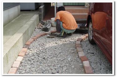 工務店との話合いの時、外構の見積もりは30万円でした お金ないのに。。。30万は、いた~~~~~い!! と、言う事で自力ですることに決めました その他にも理由はあるけど長くなるので tomuko父が土木関係の会社に勤めているのでタダでジャリをひいてもらい とりあえず、玄関前に人が歩ける道を作ろうと、思い立ちました コンクリは自分たちでやるには難しい&じゃまくさい&可愛くないので却下 色々と悩んで簡単で比較的安くつく『固まる土』で作る事に決定~ 最初にレンガをテキト~に置いて、だいたいの感じを tomukoが旦那に指示します ←えらそー 旦那くん、モルタルでレンガをくっつけてくれています ちなみにtomukoは目地をスポンジで拭く係です こんなんできましたー。 曲線をテキトーにつけてみました。 階段に合わせてまっすぐにすると駐車スペースがたりなくなるの~ レンガの間に固まる土を えいや~ っと撒きます 固まる土だけじゃ面白くないので あしあとレンガを組み込んでみた 可愛い 歩道完成 あれ?あしあとどこだ この歩道だけでも、グッと良い感じになりましたねー 自画自賛w 濡れているとオレンジですが乾くと、もうちょっと茶色っぽいというか白っぽくなります 使用した 固まる土は 『まさ王』オレンジ でっす 15kg入り 1袋¥598 を15袋 使用しました