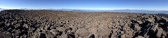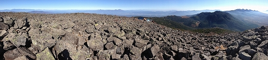 10月28日 蓼科山山頂直下に建つ蓼科山頂ヒュッテを過ぎると、いよいよ蓼科山山頂です。標高2530mの蓼科山の山頂は、直径約100mの火口跡になっていて、一面岩だらけというのは、ガイドブックや写真集などで知っていたし、イメージしていたのですが、想像していた以上に、はるかにスケールが大きくて、びっくりです。本当に、山頂部はすべて、岩、岩、岩…岩が累々と一面に広がる一種異様な光景です!こういう山頂があるんですね。そして、その岩だらけの山頂部の向こうには、まさに360度の絶景が広がっていました!これも想像以上の絶景!!素晴らしい!のひとことです。まず南を眺めると、手前に北八ツで一番存在感のある北横岳!そしてその向こうに、八ヶ岳連峰が見えます。今年の3月と8月、二度、北八ツ最北の北横岳に登った時、山頂から見る八ヶ岳連峰を楽しみにしていたのですが、二度ともくっきりとは見えませんでした。でも今回は、その時の悔しさを払しょくして余りある八ヶ岳連峰の眺めでした!最高峰赤岳を筆頭に、左側に横岳と硫黄岳、その手前に双耳峰の天狗岳、赤岳の右には、中岳、阿弥陀岳、権現岳、編笠山、西岳。西岳以外は、全部登ったことのある山なので、見ているだけで嬉しくなります!八ヶ岳最高です!