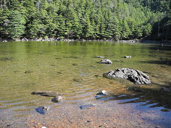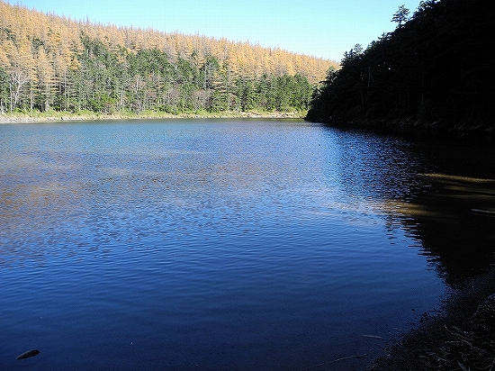 10月28日 蓼科山&池巡りヒュッテの前から左手を見ると、大岳をバックに、雄池がひっそりと湖面を横たえていました。いい雰囲気…!最高です!さっそく、湖畔に向かいましたよ。本当に水がきれいです。実はこの雄池の水は、そのまま飲めるんですよ。湖の水が、そのまま飲めるなんて、日本に他にあるのかなぁ。風が収まると、湖畔の木々がきれいに湖面に映りました。あとは双子山を越えて大河原峠に下山するだけなので、ここでのんびり過ごしましたぁ。約1時間、ここで過ごしているあいだ、会ったのは、テント泊の人が一人、水を汲みに来ただけ。あとはこの景色をずっと独り占めだったんですよ。最高の時間でした!くつろげましたぁ。