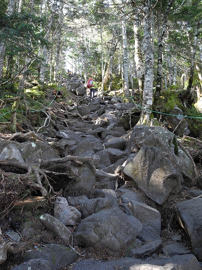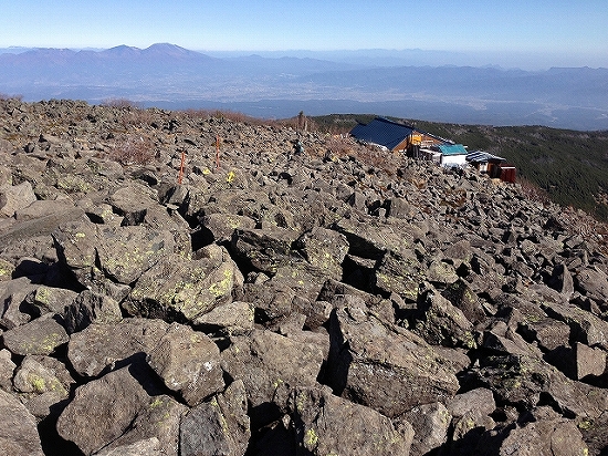 10月28日 蓼科山将軍平からは、岩がごろごろと積み重なっている登山道の急登を、ひたすら登っていきます。遠くから眺めると端正な円錐形の山頂部ですが、実際は、岩でごつごつ、かなりの急こう配です。一足一足、確実に同じテンポで登っていき、森林限界を超えると、一気に展望が開けました。足元には、将軍平に建つ蓼科山荘と歩いてきた前掛山、その向こうには、佐久平をへだてて、浅間山が見えます。アップすると、こんな感じです。浅間山は、まだ登ったことがありませ~ん。その奥に見える雪で白くなっている山は、上信越国境の山かな?右のほうを見ると、ごつごつした特徴のある山が目に飛び込んできました。両神山です。すぐに分かりますよね。今度は、左に目を向けると、こちらは、白馬岳を中心とする、北アルプス北部の山々です。今日は快晴!空気も澄んでいて、本当に遠くの山までくっきりと見えます。蓼科山山頂からの360度の大展望!期待できます。わくわくしながら、登っていきました!