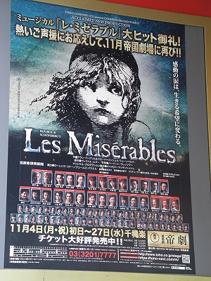 先週の木曜日の「県民の日」、帝国劇場に、ミュージカル『レ・ミゼラブル』を観に行きました!昨年12月mに観た映画『レ・ミゼラブル』は、このミュージカルの映画版です。深い感動を与えてくれた映画版『レ・ミゼラブル』…次は劇場で!と思っていたのが、ようやく実現です!帝国劇場は、やっぱり違いますよね。四季劇場と違って、ゴージャスな感じがします。出演者一覧です!主役のジャン・バルジャンは、かつて劇団四季で活躍していた福井晶一さん!「キャッツ」でのマンカストラップ役や「美女と野獣」のビースト役で観たことがあるので、楽しみにしていましたぁ。他にも、ソロを歌う俳優さんたちは、錚々たるメンバーです!ミュージカル、良かったです!感動しました!やっぱり『レ・ミゼラブル』は特別です。ただ、これは映画でも思ったのですが、ふつうの台詞のようなところも、全部「歌」…という作りはどうなのかなぁって思います。ふつうの台詞もあると、歌の部分がもっとインパクトが出てくると思うのですが…。これは素人の考えかなぁ。でも、ミュージカル全体から考えると、それは小さなこと…圧倒的なスケールで描かれるドラマに、感動しました。「生きる」ということの意味、愛、勇気、希望…私も一度きりの人生を、誠実に生きたい!って、改めて決意しました。終演後、ちょっと帝国劇場内を見て回りました。大階段を昇って2階に行くと、舞台の小道具なのか分かりませんが、『レ・ミゼラブル』の世界を表現しているコーナーがありました!