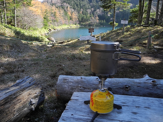 10月28日 蓼科山&池めぐり雄池を眺めながら、ランチをいただきました。実は、雄池の水でラーメンを作り、コーヒーを入れて飲むのが、今回の楽しみの一つだったのです。時間はもう午後1:30過ぎ…結構おなかがすいていたのですが、この楽しみのために、行動食を少しずつ食べながら、ここまで我慢したんですよ。実は、雄池の湖畔では、水質を守るために飲食禁止で、ザックも持ち込んではいけないことになっています。だから、雄池が一番よく見えるベンチで、一人でのんびりお昼をいただきました。ランチ…と言っても、ラーメンを食べただけですが、晩秋の湖畔の景色が、最高の「おかず」になりましたよ。食後のコーヒーもまた格別でした!あっという間に時間が過ぎて、午後2:30…秋の日差しは、もうかなり斜めから差し込むようになってきました。名残惜しいのですが、そろそろ双子山に向かって出発です。双子池、また来ま~す!