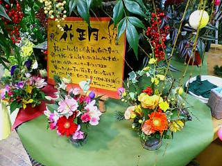 今日はアレンジを作りました。1800円くらいかわいいでしょ?後ろの「花正月」という字は嫁が書いてます。もちろん言葉は、いろいろな本から抜擢してちょっと変えてます。でも、「花正月」なんかいい言葉です。花で飾ってお正月を迎える。これは日本の文化ですよね・・・花(特に花木)は何百年もそこで毎年花を咲かせ続けます。花の命は、「はかない」という人がいますが、花(特に花木)は僕が生まれる前からそこで花を咲かし続け、僕が死んでも、そこで生きています。すごく長生きなんですね。だから本当は、僕たちが花を見ているのではなくて花達が僕らを見ているのかもしれません・・・・