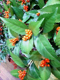 もうすぐお正月です。店内も正月用品が並んでます。松や梅よりも千両が一番正月っぽい気がします。千両は黄色もあるけどやっぱり赤が好き!千両と万両の違いは知ってますか?細かくいえばいろいろ違うんですが、ようするに千両は葉の上に実が付いていて、万両は葉の下に実が付いています。ちなみに千両の花言葉は「可憐」・・・?可憐かな?千両って年に1回千両市ってのがあってその日に市場でセリにかけられます。この時期に千両見ると正月気分を味わえるけど夏に見ると千両って可愛くないはず・・・・