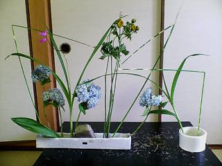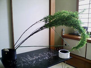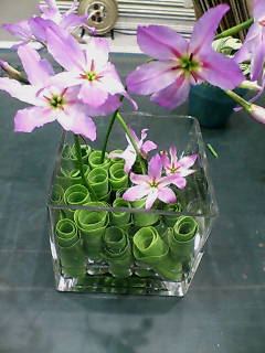 テーマは「絵を描くように・・・」平面構成で、絵を描くように・・・あとは自由というレッスンでした。こういう平面構成で、ラインの動きを見せるデザインは好きだし、得意です。。。。今回は、先生にも「まっ、いいんじゃない?」って言われました。だんだん暑くなってきたので、今日は半そで、半ズボンです。(そんな言い方しないよね。。。Tシャツとハーフパンツ?)暑いので、花も上手に管理してやらないといけません・・・・今日の夜は毎週恒例のソフトの練習に行きます。しかし、下手なんで苦労します・・・・明日は、また小学校に花を教えに行きます。小学生に負けないくらいハイテーションでがんばります!
