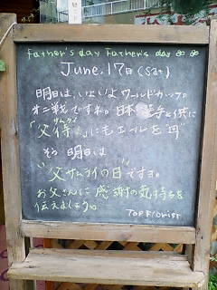 うちのお店では、毎日うちの嫁さまが黒板にいろんなコメントを書いてます。そして、昨日こんなのを発見しました。何て書いてるか見えますか?そうです。サッカーで「サムライブルー」とか言ってますが、皆さんの家にも、毎日戦う「父サムライ」がいるのです。絶対に負けられない戦いがそこにはあるはずです!今日ぐらいは、お父さんを大切にしましょう。(僕が一番大切にしてないです・・・・仲が悪いんです。。。。)そしてそして、今日はクロアチア戦。。。。もうあえてそのことには触れません。しかし昨日遅くまで、ガーナVSチェコを見ていたのですが、ガーナの選手はすごいです。早いし上手い。。。。。フイジカル面では言う事ありません。パス回しもチェコを圧倒してました。日本もあんな試合ができれば・・・・・・最近サッカーばっかり!がんばれ、日本!がんばれ、父サムライ!がんばれ、俺!