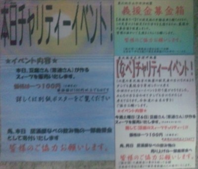 音楽の話題ではないんですが、今日は告知があってブログアップします。ボクがいつも行っている居酒屋のマスターと昨日話していて、「ボクたちに何か出来ることはないだろうか」という話題になりました。そこで、決めたこと。その居酒屋でチャリティー用に募金を募り、募金してくれた方にお礼にスイーツをプレゼントすることにしました。今週26日の土曜日、いつもお世話になっている名古屋市北区の味鋺の居酒屋「なべ」で、そういうイベントをすることになりました。集まったお金は「なべ友の会」の名でどこかに義援金として寄付します。名付けて「スイーツチャリティ in なべ」。 家庭的な安い素材で作るお菓子になります。高級なお菓子ではありません。集まったお金は全額義援金に回し、赤十字に送金します。 また無理なことをと心配しないでくださいね。 ボクを含めて「居酒屋なべ」の想いにほんの少しの額でいいから協力してください。 「なべ」のマスター、提案に賛同してくれて感謝しています。よろしくお願いします。 まあ、でも、遠くから無理して駆けつけたりしないでいいですよ。ただ、やれることをすこしだけやろうね、ってボクらの想いです。近所のみなさん、よろしく、って感じで。