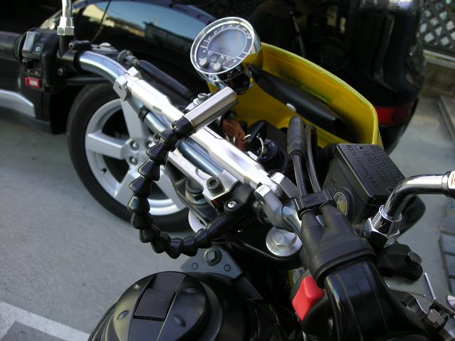 「信号待ち、暖気運転時にヘッドライトは点灯したくない!!」つー事で、前回、ライトNO・OFFスイッチ付けました。OFF時ブルーのLEDが点灯するも、フロントカウル内なので、光量が足りず、安全上問題が・・・。「だったら、ヘッドライトOFFするな」・・との意見もありますが無視。。ハンドルスポットライトギアがニュトラル時のみ点灯。白色LEDで、ライト部分が自由に動くので夜は便利かも?