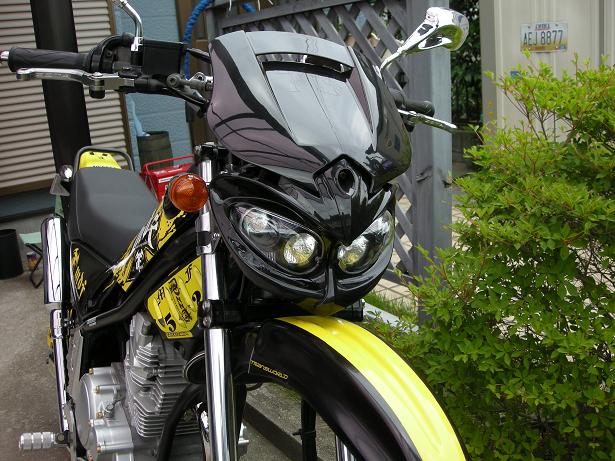 フロント周り変更決行!汎用品ですが、干渉もなく いい感じに取り付きました。横から・・。ライトの配線は、Hi→ON(4灯) Lo→OFF に。取り付けボルトを ステンのキャップにへ変更。でも、トータルで送料込みで 5500円弱。安っ。。はたして、耐久性はいかに?