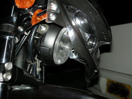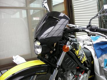 ライトを4インチスチールボディに交換。純正のプラスチックは、イマイチでったので。バルブはH4 55/60W スモールランプ付き。ニュトラルで、スモールランプの点灯が可能のため、ハンドルランプ(サソリw)は外し。ライトを小さく、取り付け位置を下方にずらしたため、フロントカウルは必須。で、きのう破棄したドラゴンマスクをバラし、上半分を、市販の取り付け金具でしっかり固定。全部、汎用品の流用なのでこんなもんかな。