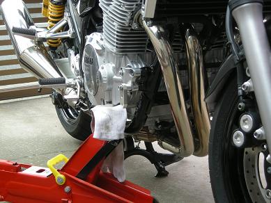 猛暑続きで、体力低下中~wwなんで、立ちゴケ対策品のスキッドパット By モリワキ取り付け。 エンジンマウントボルトに共締めタイプ。取り付け孔がずれない様、ボルト一本づつ交換するも, さすが1300ccエンジン 重みで孔位置ズレてモリワキ入りませーん。 でもジャッキUP↑でなんとか取り付け↓ クラッチ側の流れで・・・ ブレーキ用のマスターシリンダーキャップも交換(^^: