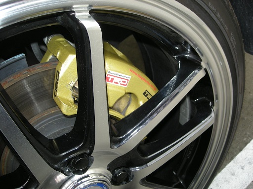 NCP131 Vitz RS キャリパー塗装にステッカー。ゴールドに塗装したキャリパーにTRDのステッカー(耐熱でありません)を貼ってみました。前輪後輪あまり目立ちませんが、ステッカー大好きオヤジには、満足です(=^・^=)