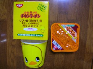 日清のカップめんのリフィルって知ってますか?チキンラーメンやカップヌードル、日清のどん兵衛などの中身(めんとかやくなど)だけを、従来の80%まで圧縮してコンパクトにパッケージしたものです。この、専用のひよこちゃんガラスカップに入れて、電子レンジかお湯で簡単に調理できます。ガラスカップはひよこちゃん柄のホルダーから簡単に外れます。ひよこちゃんマグカップチキンラーメンリフィル(8個)付き 税込4,200円以上で【送料無料】【お買...価格:1,260円(税込、送料別)