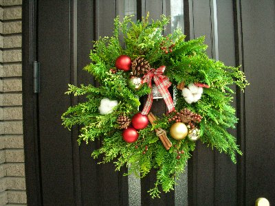 今年のクリスマスリースです。もみが手に入らなかったので、花屋さんで買ってきた黄金ヒバとコヒバ、うちのブルーアイスです。これで大きさは、葉先から葉先まで50センチです。昨年からフレッシュリースを飾っています。やっぱり、生の木は、いい香りもするし、想像以上の豪華さです。土台から作るもよし、土台を買って、リボンやべルなどの飾りだけをするのもよし、全部やってもらったのを飾るもよしです。クリスマスが終わったら、バラして土台や飾りを取っておいて、来年自分で生木を購入して作るのもオススメですよ。モミ、ヒバ、ひむろ杉から選べますクリスマスリースのベースとしてクリスマスリース★プレーン・フレッシュリース■35cm【生】10P23oct10ひむろ杉がメインで月桂樹の枝を使っていますクリスマスプレゼントに★お歳暮に【早割り価格】クリスマスリース★メリークリスマスフレッシュリース■35cm【生】【楽ギフ_包装】【楽ギフ_メッセ入力】10P23oct10モミと桐の実を使ったリースクリスマスプレゼントに★お歳暮に【早割り価格】クリスマスリース★キャメルフレッシュリース■35cm【生】【楽ギフ_包装】【楽ギフ_メッセ入力】10P23oct1040センチのモミの木のリース★クリスマスにクリスマスリース★もみのビック・フレッシュリース★40cm【生】【楽ギフ_包装】【楽ギフ_メッセ入力】10P23oct10