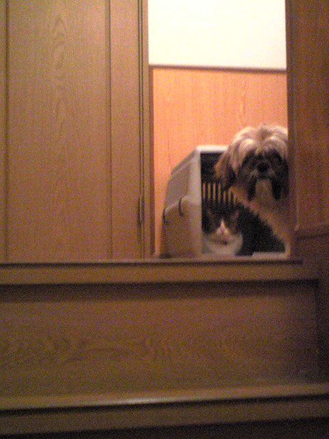おそらく、ミル達を追って2階に上がったものの、うちの階段結構急なので、怖くて降りられなくなったんだと思います。(ーー;)