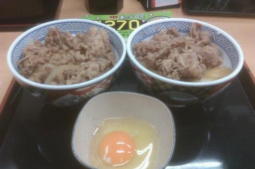先日、あるお祭りに参加した。その名も春の牛丼祭り。吉野家の牛丼が270円なので一度に二杯食べた。一つは卵あり、一つは卵なし。祭り開催中に、もう一回、一度に二杯食べた春の牛丼祭りで一度に牛丼二杯を食べるという荒業を二回行って検証した結果、いつも卵は絶対条件だったが、卵なしでもツユダクなら全然イケるということがわかった。牛丼祭りの主催者の吉野家側の思惑では、一時的に牛丼を安く提供して、おいしさを知ってもらってファン拡大を狙っていたと思うが、自分的には卵なしでいけることがわかり、卵代50円のコストカットにつながった。吉野家は売り上げを上げるどころか今後50円売り上げが下がることになる。吉野家との牛丼戦争に勝利したような気分だが、その反面牛丼一杯では満足できない身体になってしまった。今後も二杯食べてしまうだろう。その結果吉野家との牛丼戦争に完全敗北を喫してしまった。吉野家の手のひらで踊らされた牛丼祭りであった。