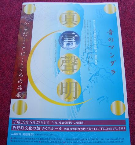 一昨日、声明の練習会があり真言声明のポスターとチラシを受け取りました。ポスターがこちらこちらがチラシの裏です。日時 平成十九年五月二十七日 1時30分開場 2時開演場所 さくらホール(板野町文化の館)板野郡板野町犬伏字東谷13-1 電話 0886-72-5888 入場は無料ですが、整理券が必要です。当日券もあるそうです。真言声明バナーも作りました。欲しい方はご一報ください。ブログランキングに登録していますクリックにご協力お願いします。 ↓人気blogランキングへ
