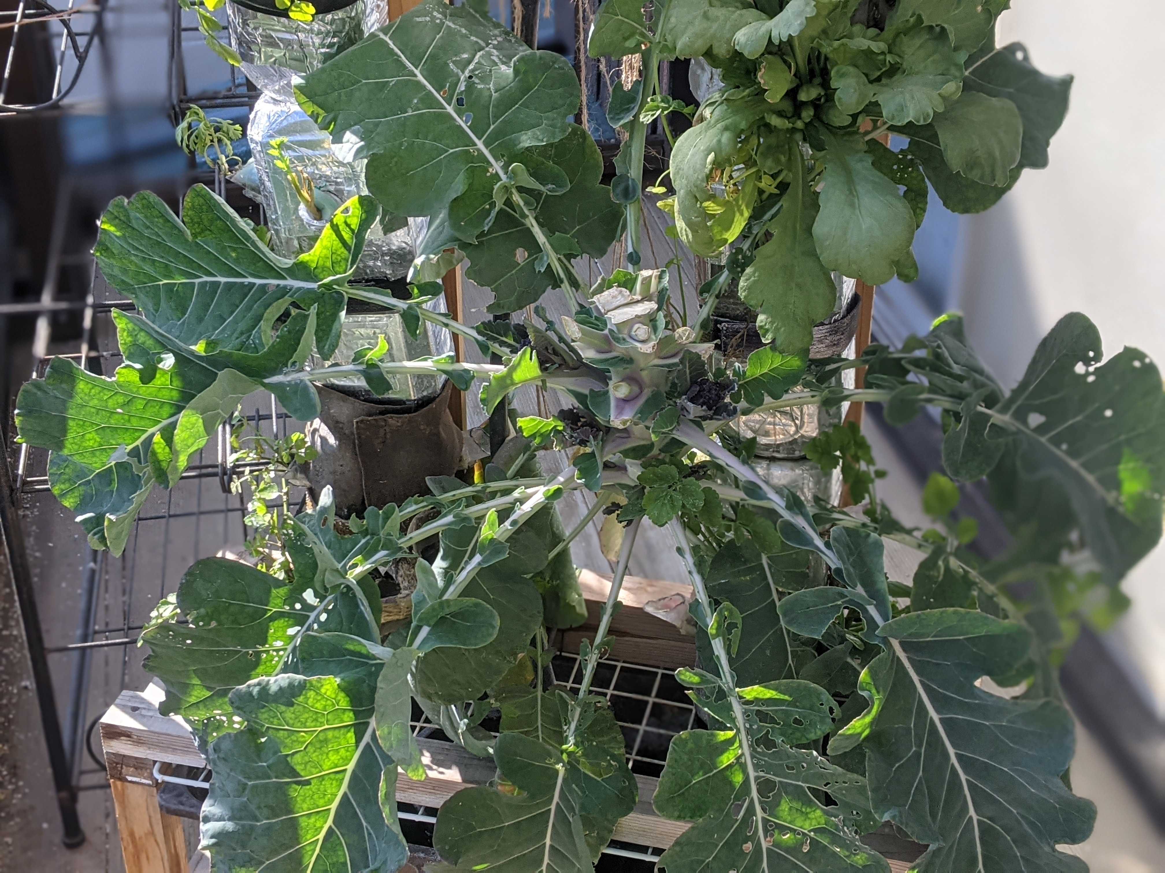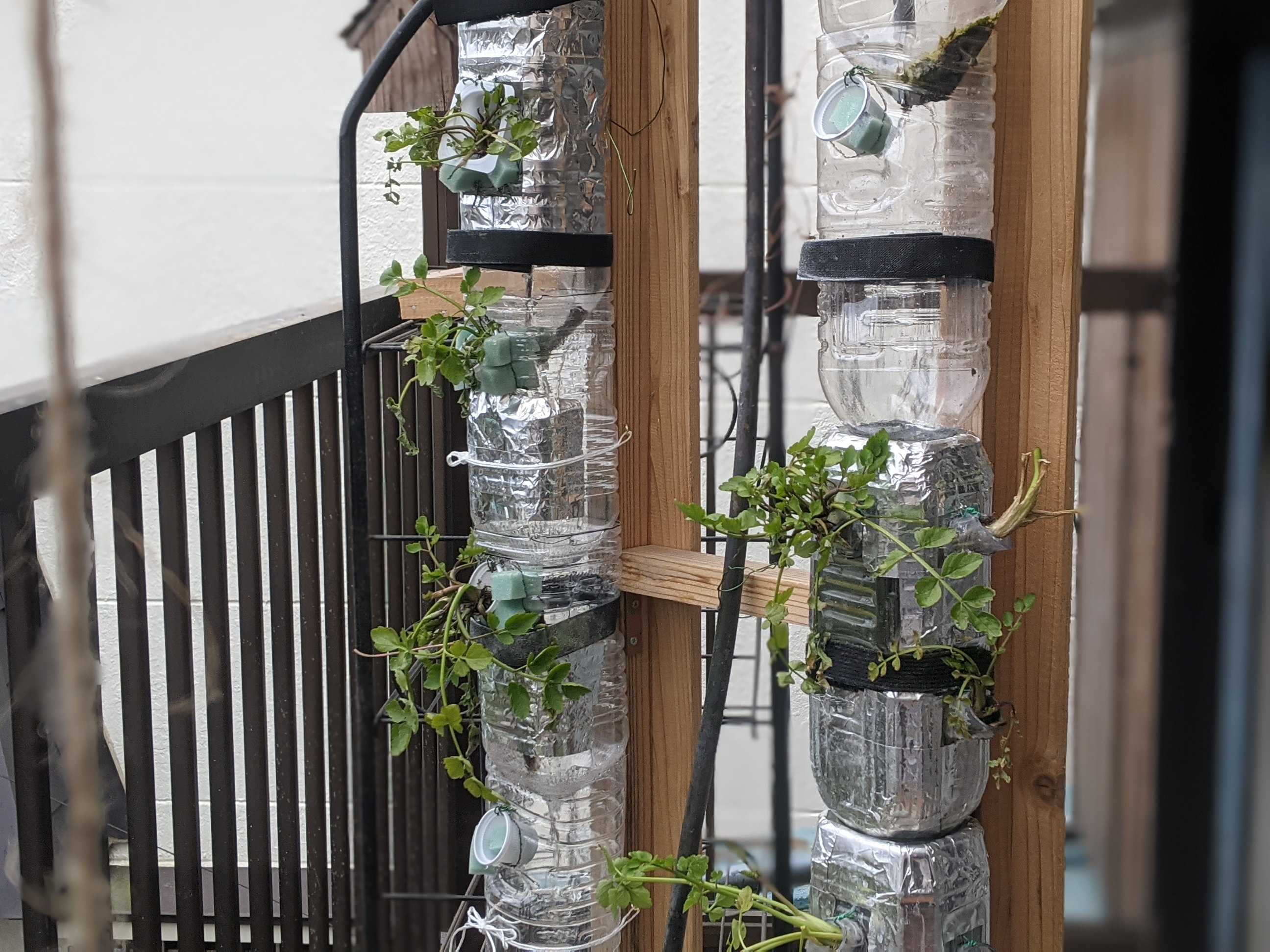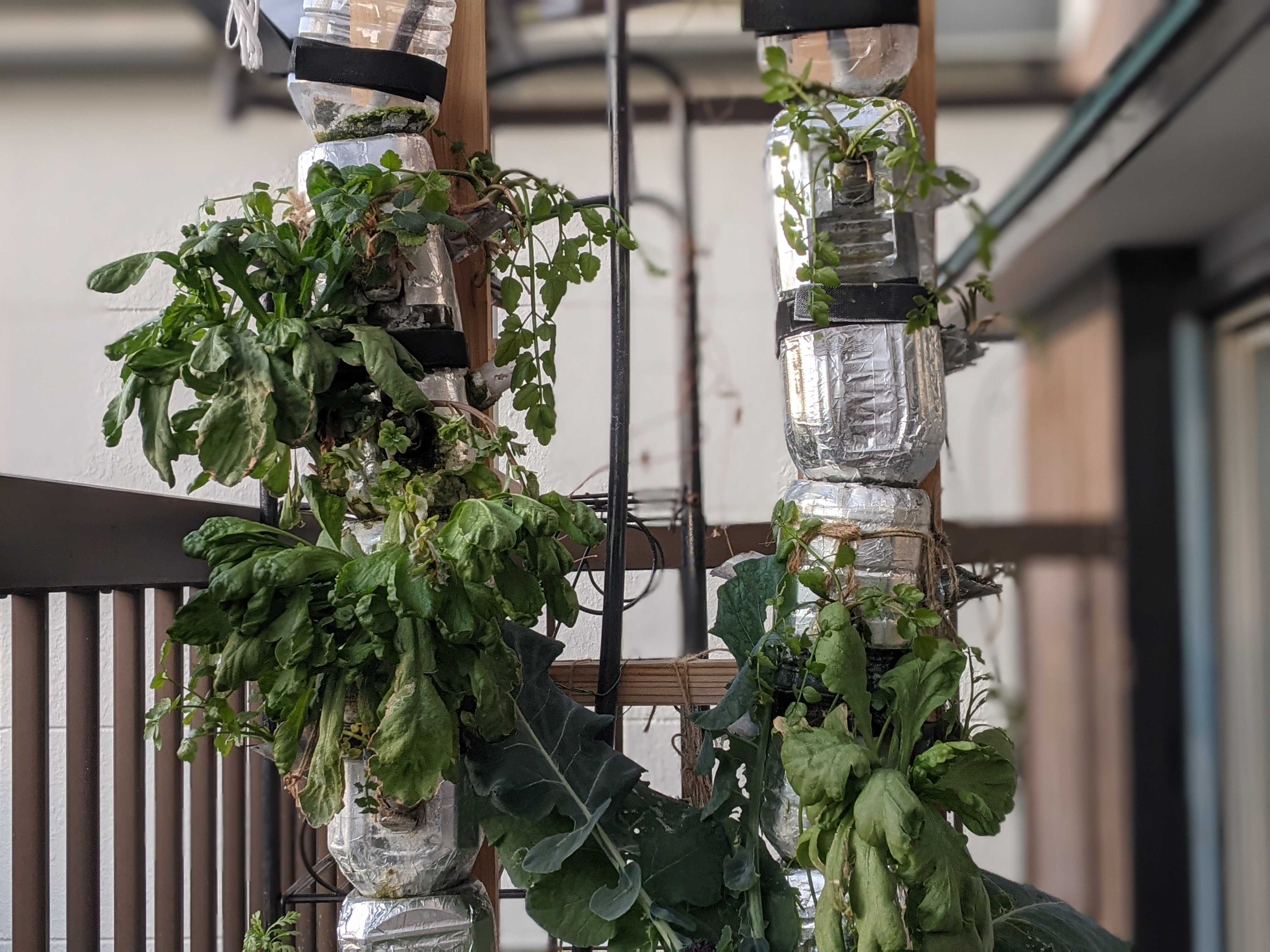 秋にすごい勢いで育った春菊。春まで頑張るかと思ったんだけれど、マイナス気温でお水が凍り始めたら、勢いがピタッと止まりました。葉も傷みだしたので、栽培終了していきます。栽培してわかったことは、春菊は水耕栽培に向きます。けれど、このタワー型には根っこが育ちすぎるので向きません。どれくらい育つのかというとペットボトル一本分の長さがある根っこ。これが、ペットボトルの口を塞いで、養液の循環を止めてしまいます。混植する他のお野菜も圧倒してしまい、枯らしてしまうことも。タワー型水耕栽培を始めた時は、一つのペットボトルに五個の穴を開けて、栽培ポケットを五個作りました。五個に全部植えると、密植になって、日陰のお野菜も出てきて育たないのもありました。また、混植した種類によっては根の発育のいい植物がペットボトルの口を塞いで、養液の循環を絶ち、そのペットボトルの他の植物を水没させたり、タワー全体の流れに影響が出ました。数日考えて、タワー型栽培をやめようかと思ったのですが、手入れを簡単にして続けることにしました。手入れが簡単とは一つのペットボトルの栽培ポケットを減らす→一個にする根が張る植物の栽培はしない→春菊、ブロッコリーなどは栽培しない。ペットボトルの加工を簡易なものにする→穴を開けたり、他素材をプラスするのを少なくする栽培終了時、一つの野菜に一つのペットボトルで替えれば済むようにする。