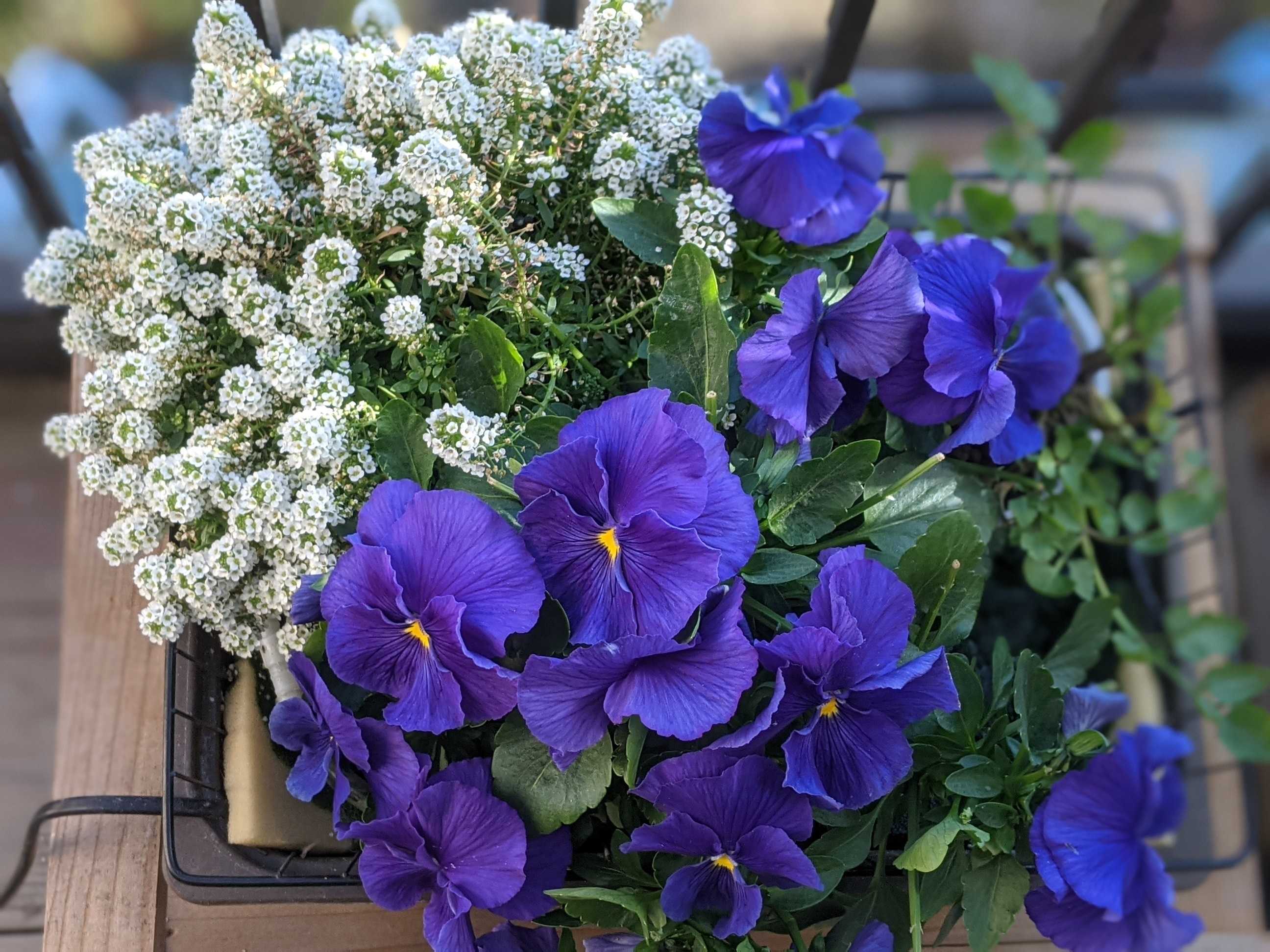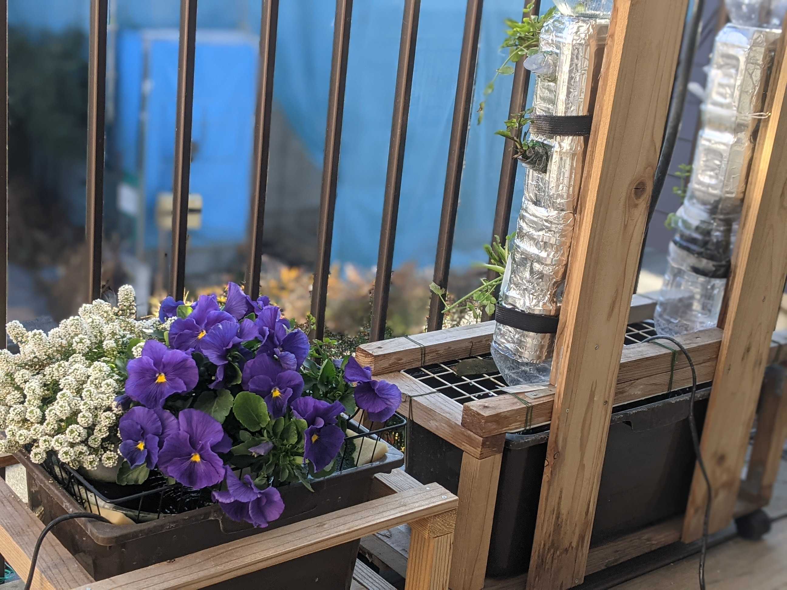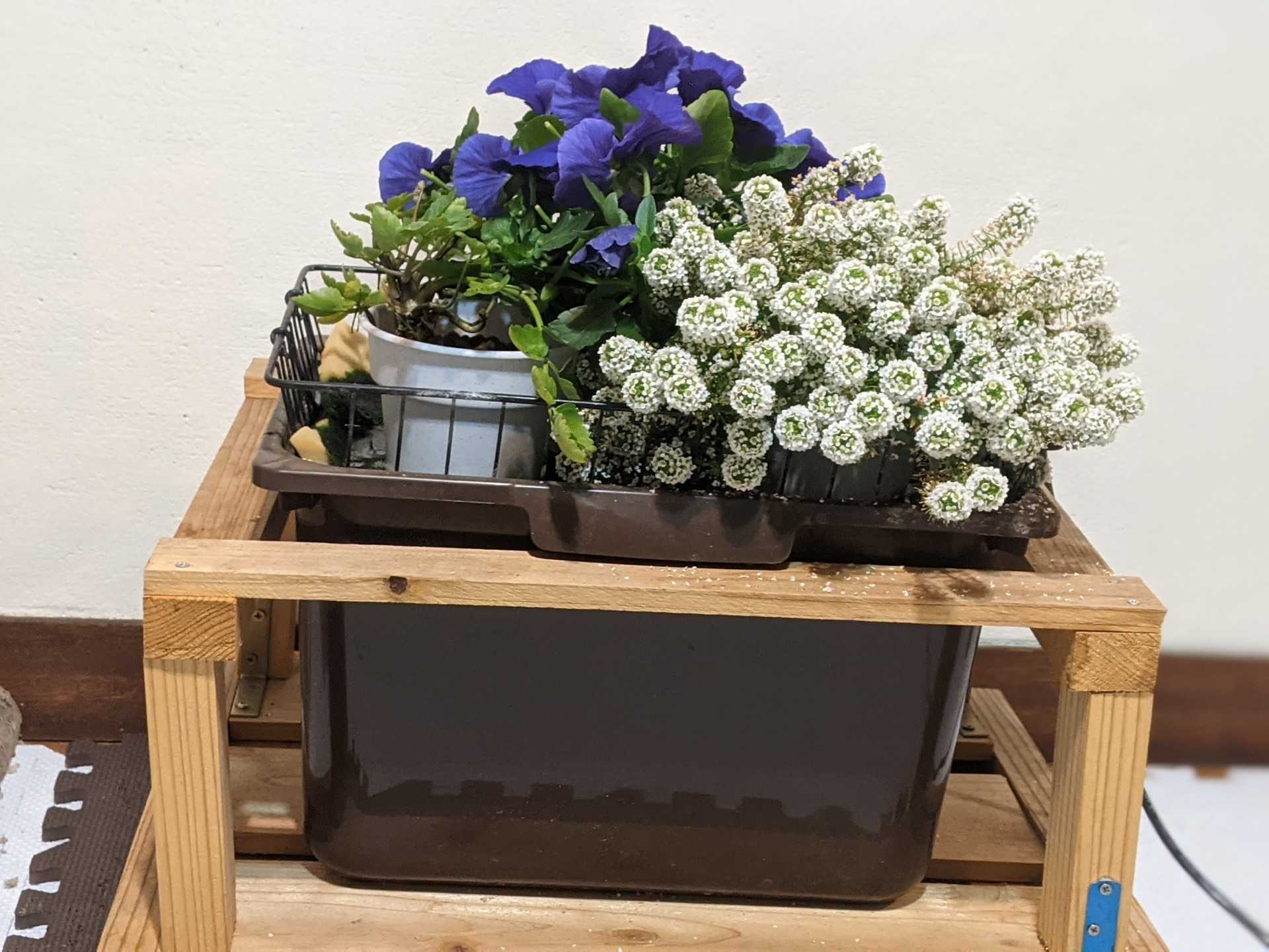 パンジーとスウィートアッリサムを水耕栽培しています。とても元気です。ストックも寄せ植えしていましたが、ストックは根腐れでダメでした。ストックがあった場所に、セリを植えました。左端にセリを植えています。培地は、ハイドロコーンの中粒にしました。この果菜型の水耕栽培は、水槽にお水が入っているので重いのですが、何とか持ち上がるので、夜には部屋に入れます。外が氷点下でも、お部屋の中なら大丈夫。可愛がっているので、応えてくれています。日中、ポカポカ陽気の時は、パンジーもスウィートアッリサムもいい香りがします。