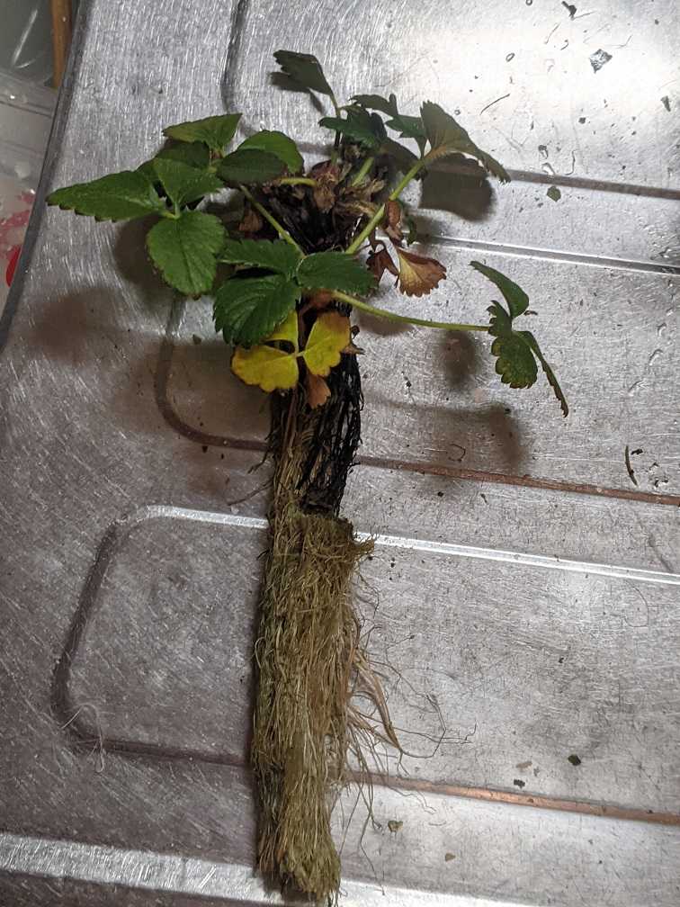 イチゴを水耕栽培していました。一つのペットボトルに複数の植物を混植して栽培していました。結果勢いのある植物に押されてしまう植物が出てきたので、混植をやめることに。水耕栽培していたペットボトルから抜きました。下の方の根は、春菊の根です。入り混じってしまったので、このまま地植えします。上手く育つかわかりませんが、様子を見ていきます。