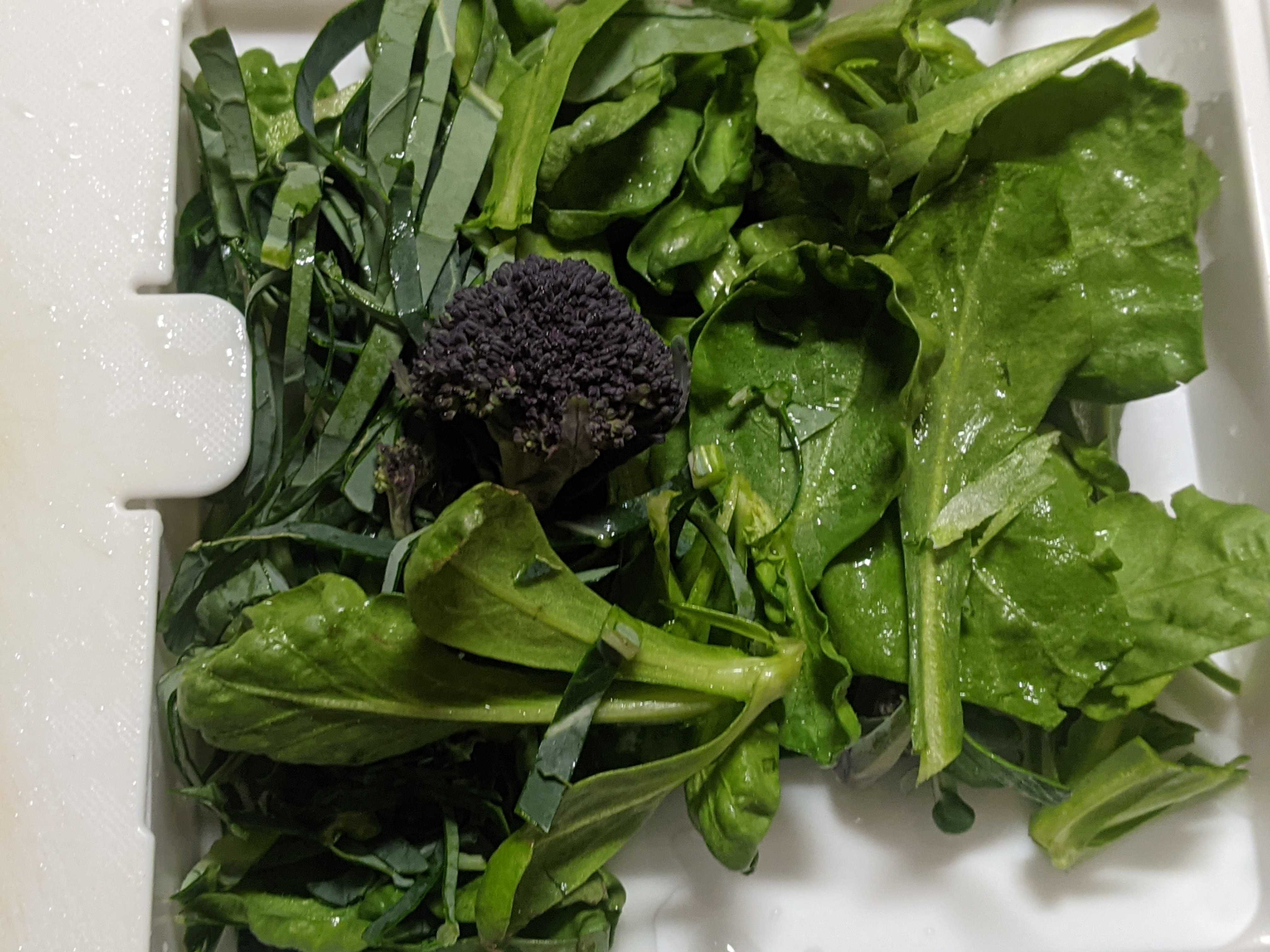 朝ごはんに摘んだ緑たち紫セニョーラに春菊です。