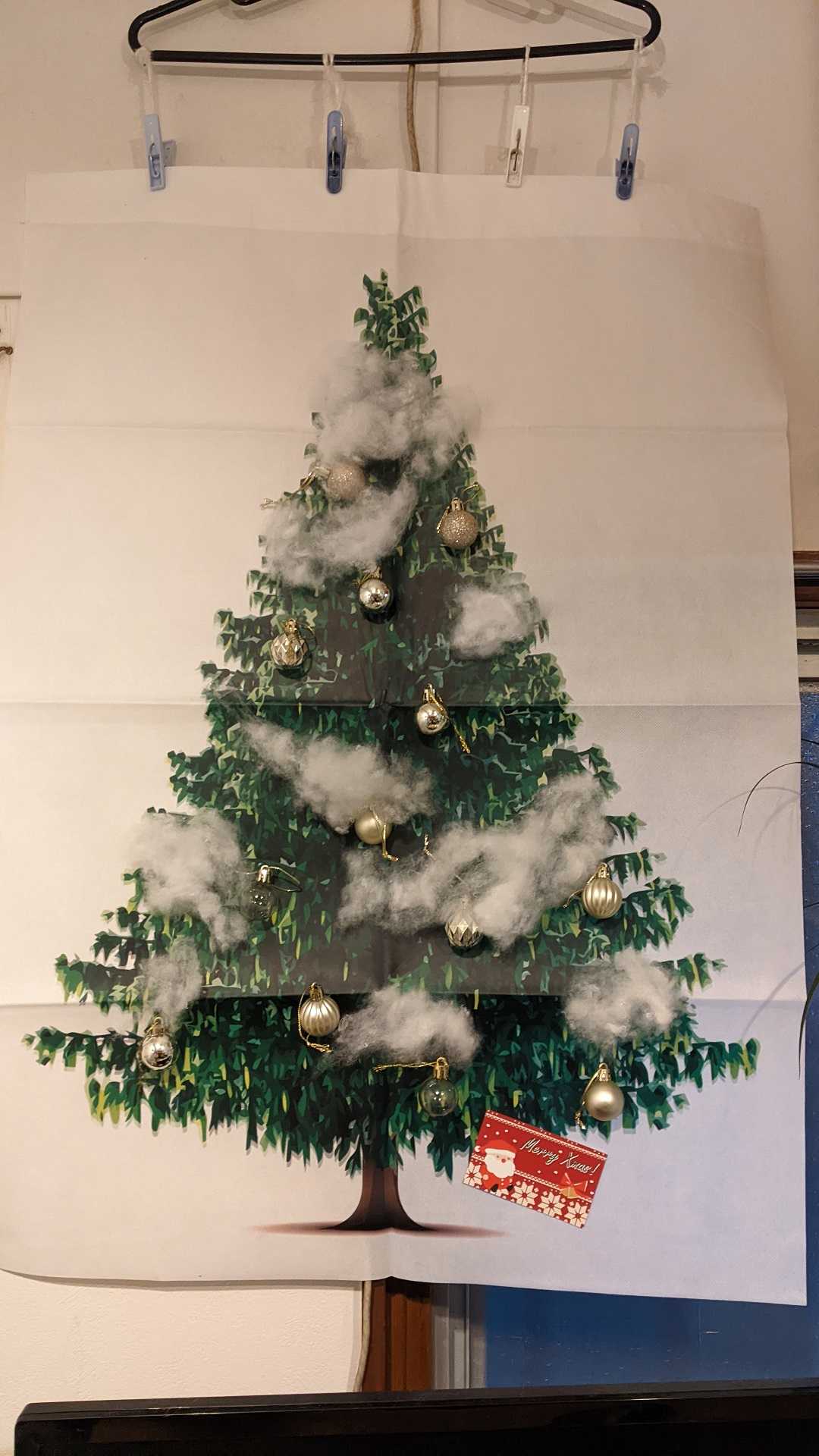 一番時間を使っているお台所にクリスマスツリーを飾りました。ご飯作って、ご飯食べて、パソコンして、動画も観る台所です。100均で提案していたもみの木のタピストリーに飾りと綿を付けました。クリスマスまで約一週間、これで気分を味わいます。猫が、母娘とも綿を引っ張ってしまうので、取れてしまい、困ったものです。