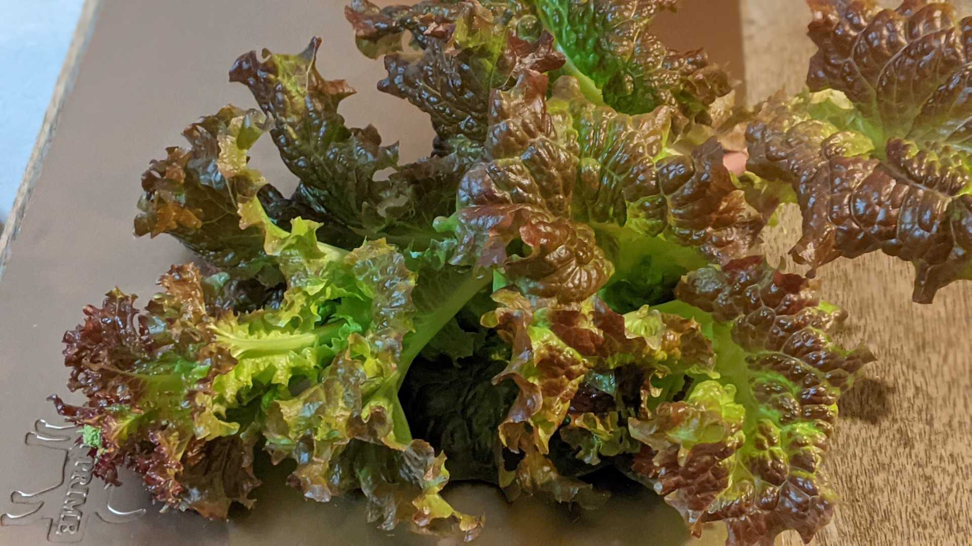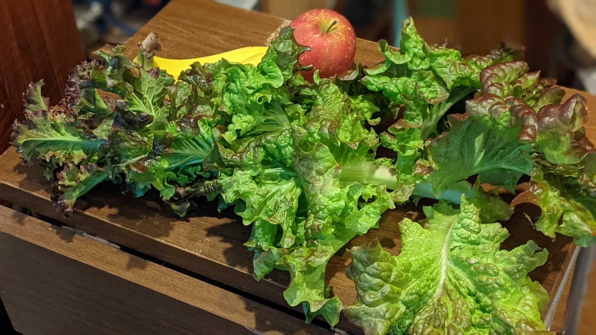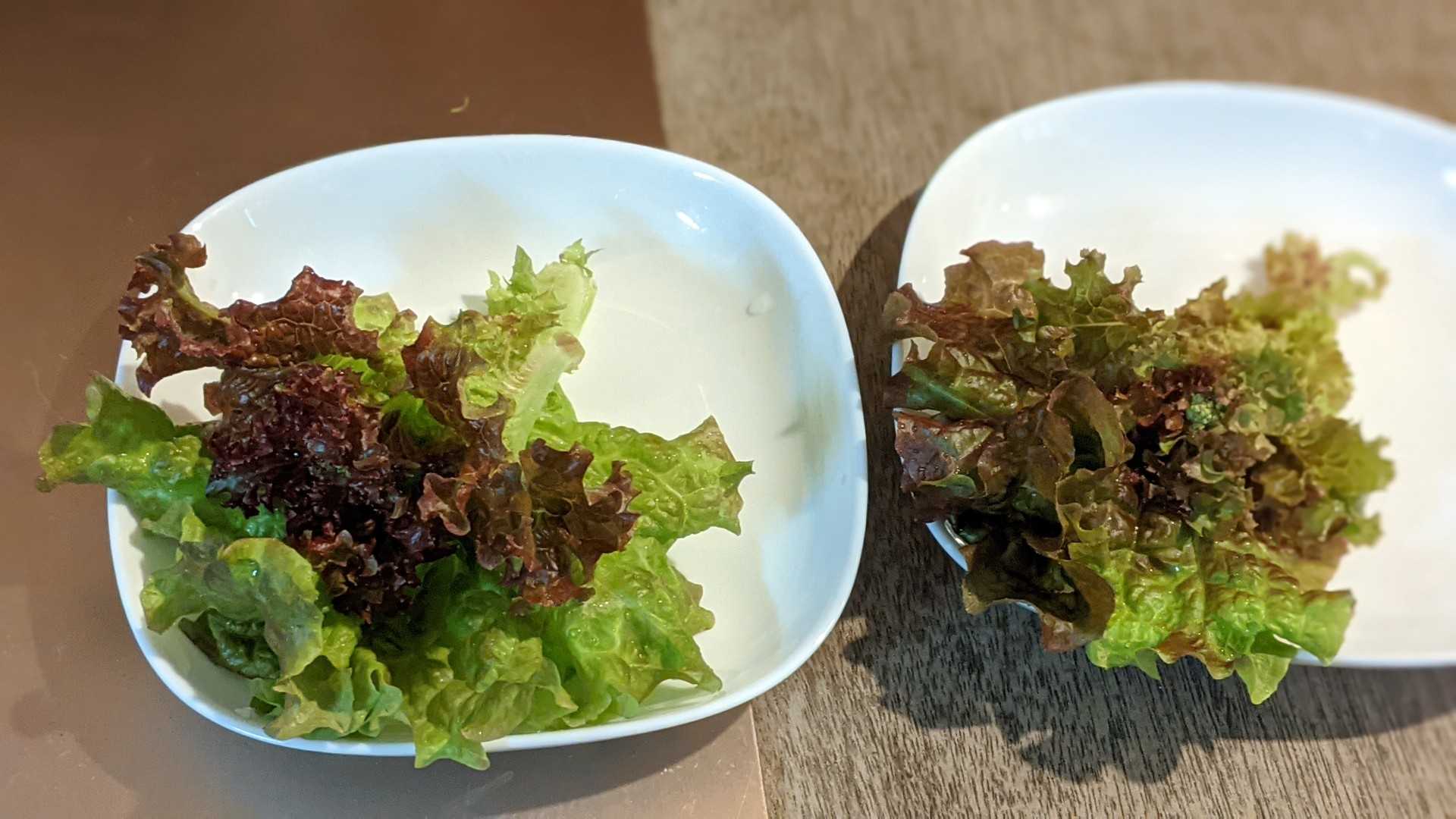 養液栽培で作っているレタスを摘みました。 1株ですが、とても大きいです。 大きな中華鍋にたっぷり入りました。でも 火を通すと3分の1以下の容量です。 味付けは、乾燥エビの粉に唐辛子の輪切りと塩コショウです。バターも後半に落としました。 毎日食べていますが、レタスの炒めたもの美味しいです。水分がたくさん出るのですが、強火で飛ばすように炒めてます。葉の緑は失われないのですが、柔らかくなって食べやすいです。味も生のときは苦いのに、火を通すと癖が無くなり、どの調味料とも馴染みます。