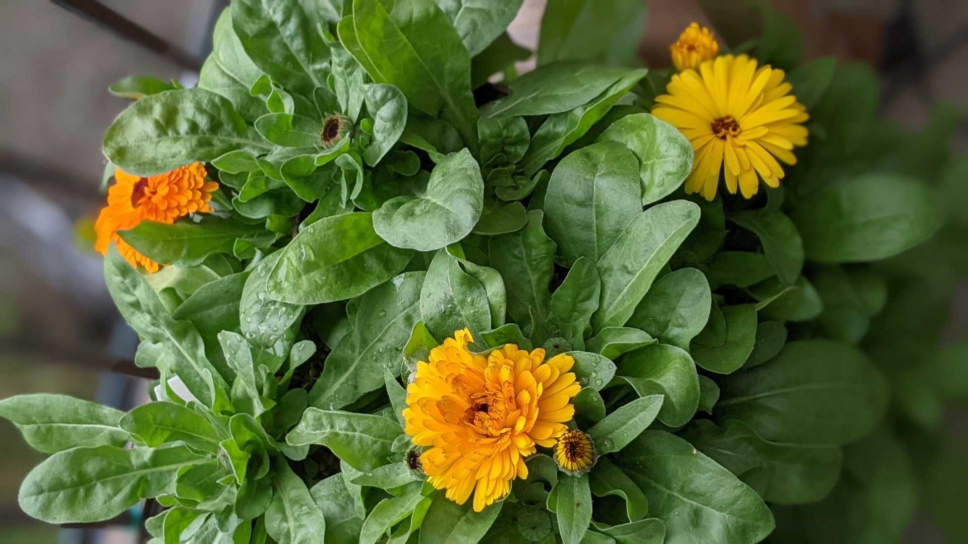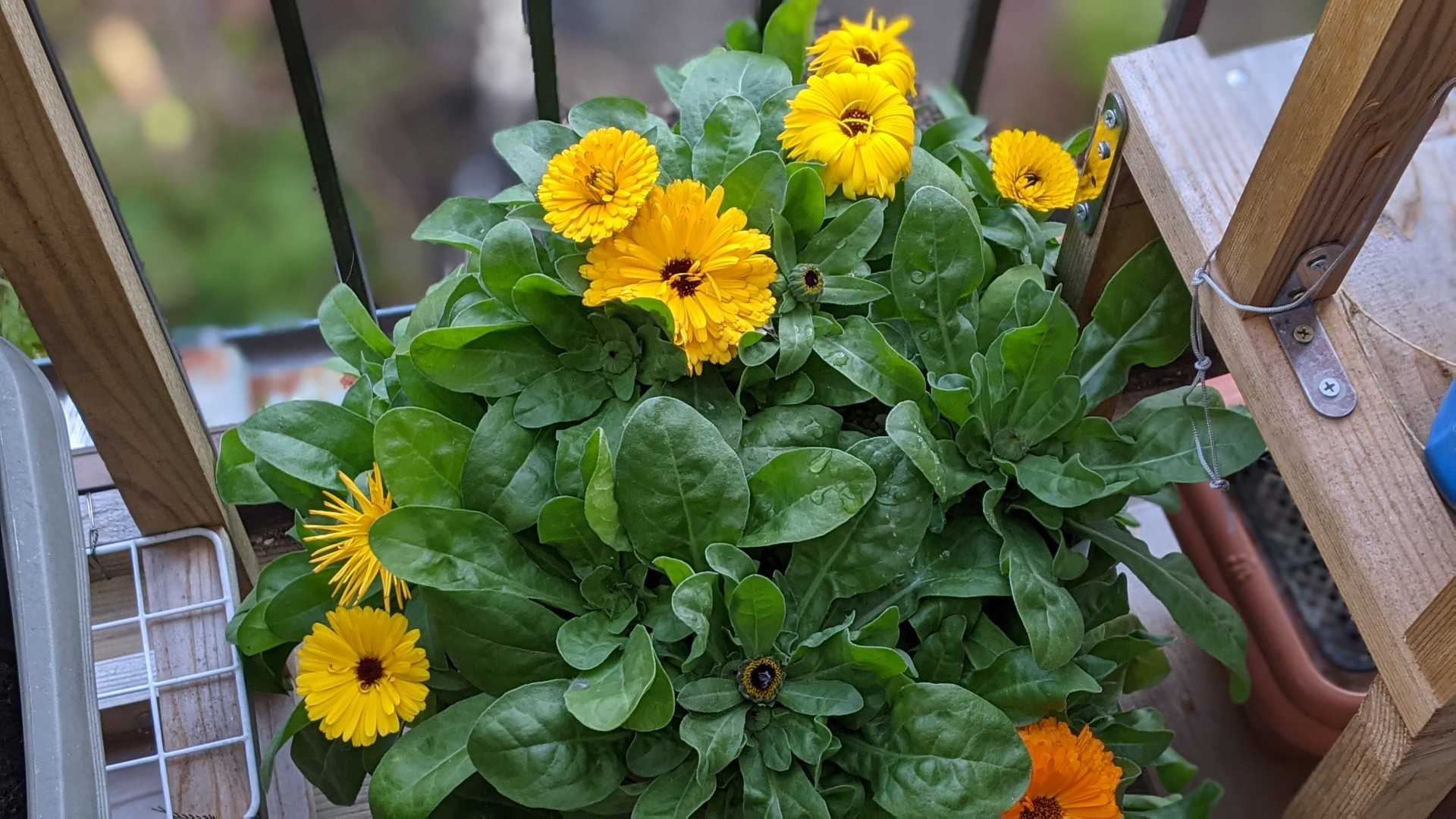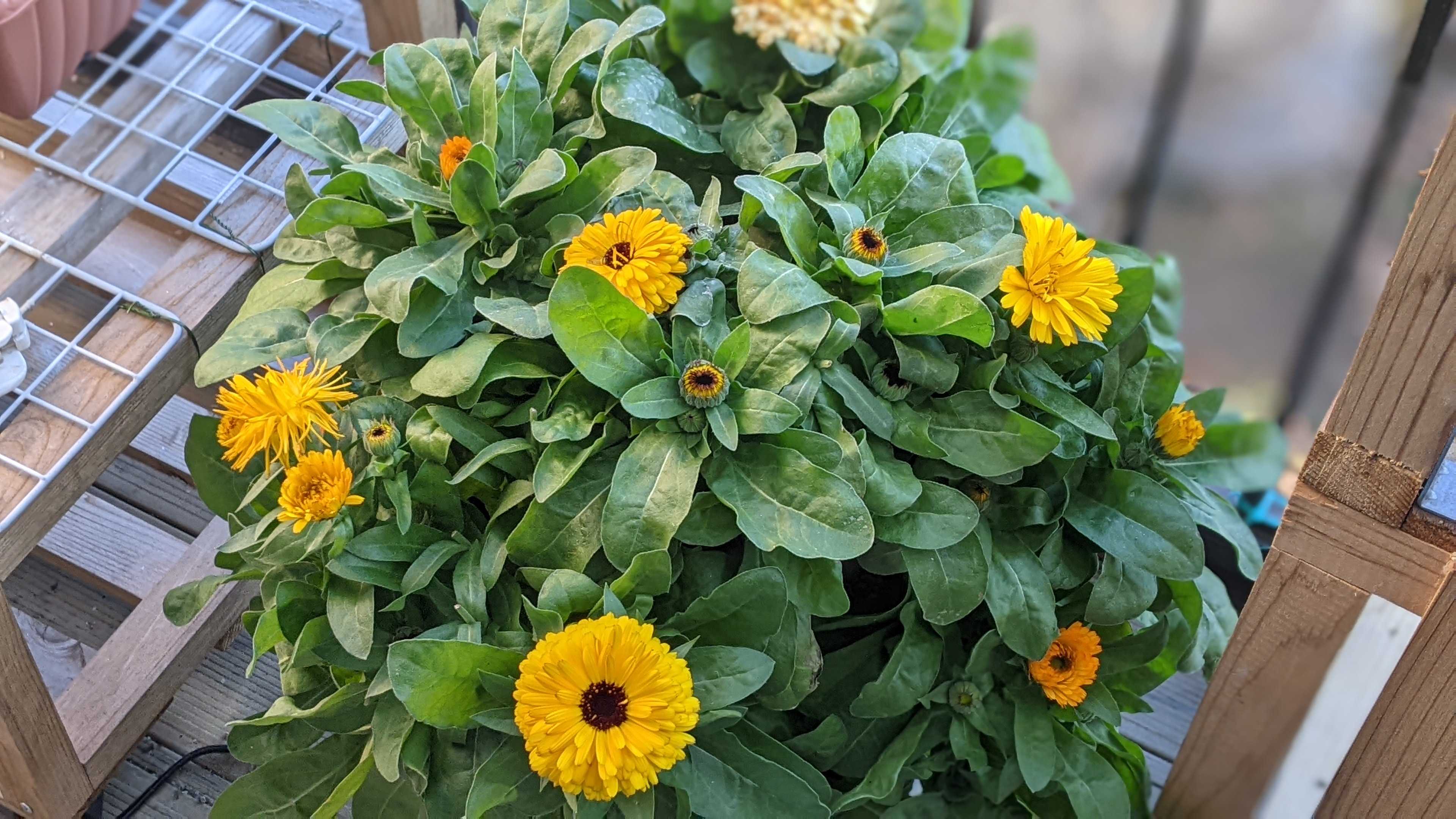 株が立派に育ってからは、とてもいい状態が続いています。軽石(日向土)での養液栽培です。鉢を三段重ねています。バルコニーのキンセンカに癒されています。ネズミは、隣の芽キャベツを食べますが、キンセンカは食べません。