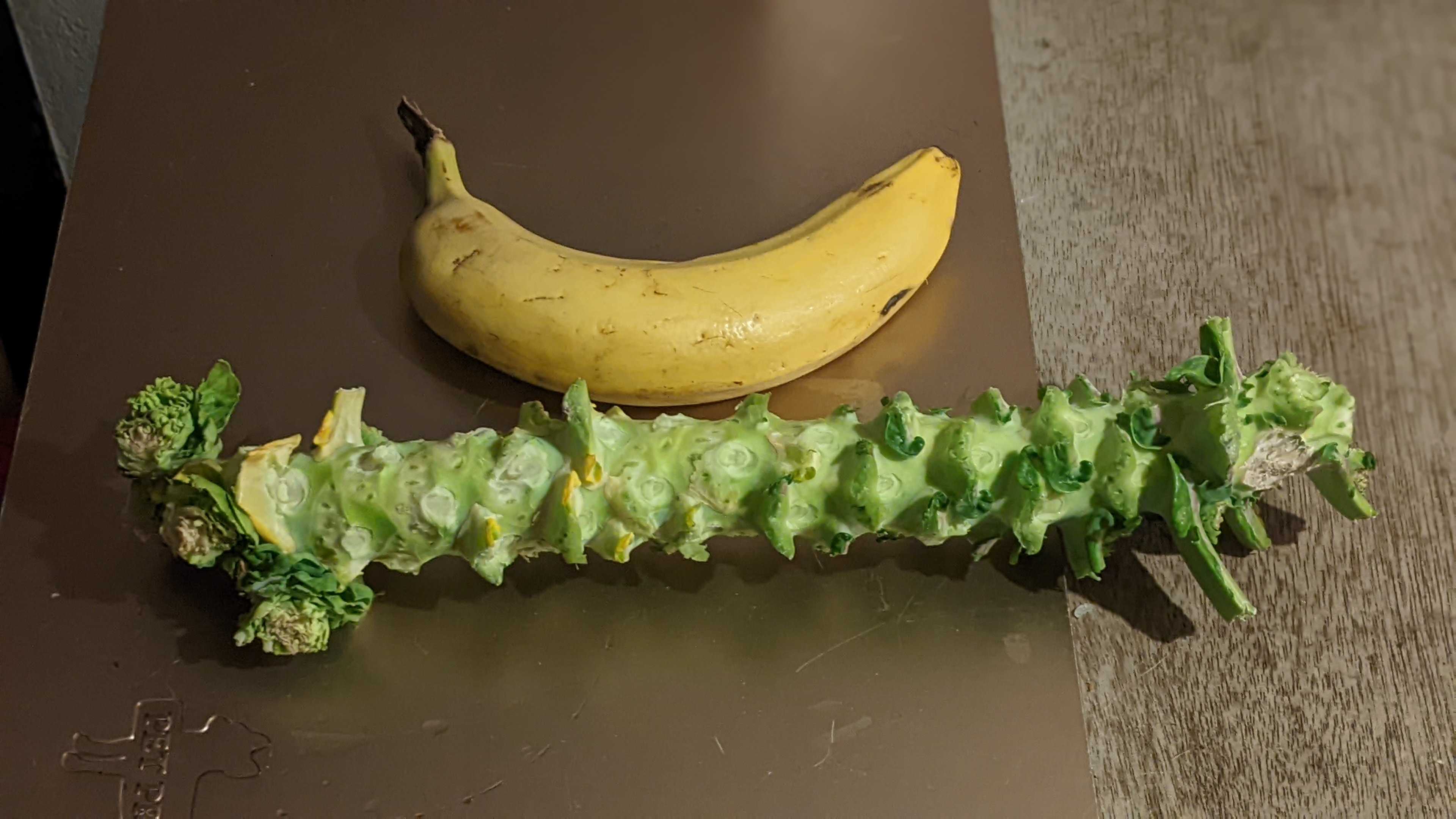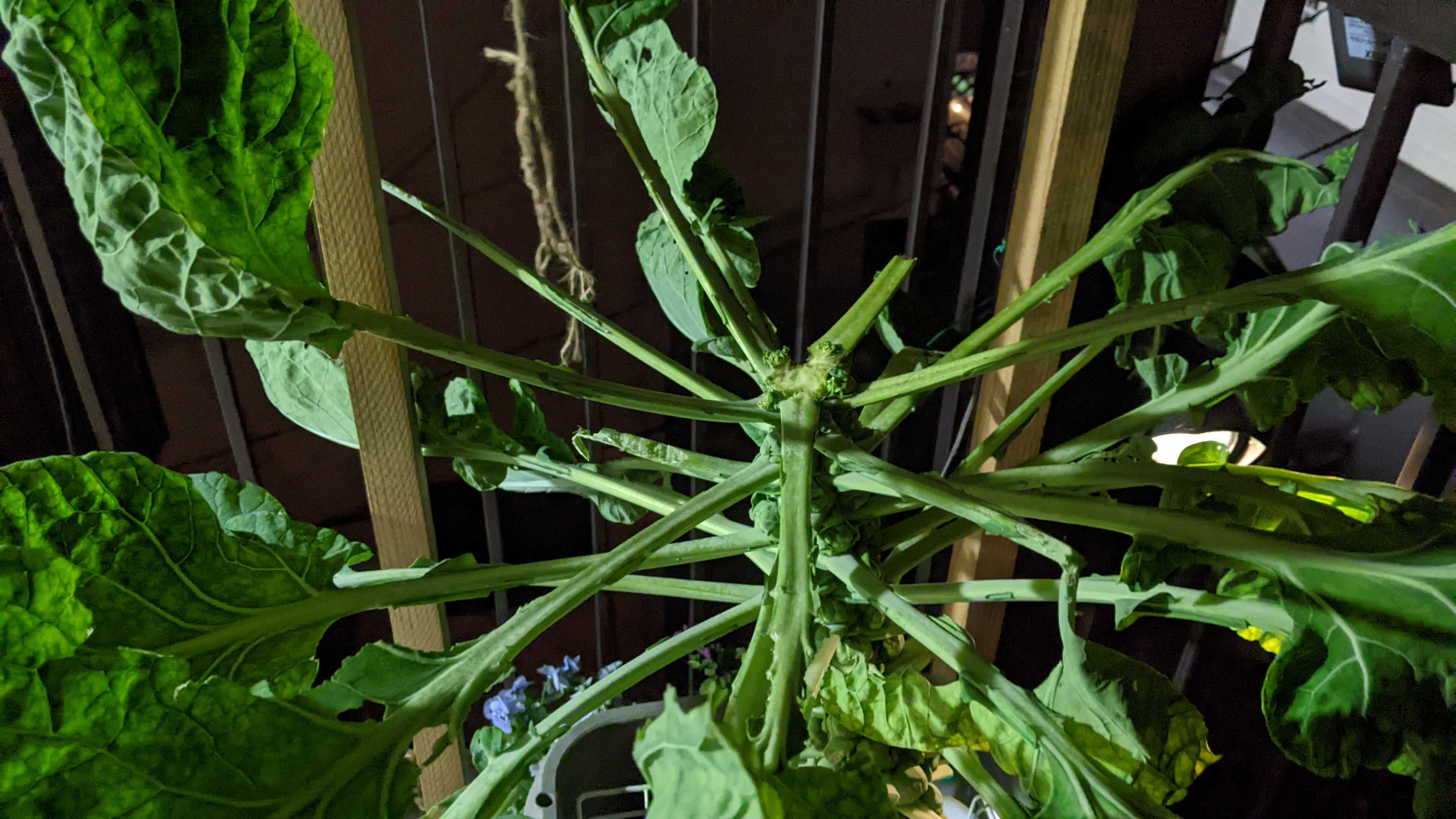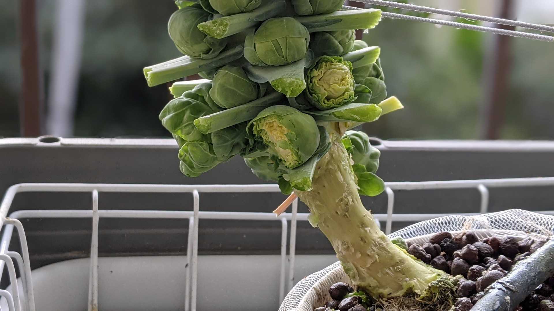 昨日摘んだ芽キャベツを今朝食べ終えました。芽を摘んだので芯だけになりました。これは堆肥置き場に放置して、肥料になっていただきます。これは昨年食べたブロッコリーです。12月の初旬に収穫できています。約3カ月かかりました。芽キャベツの収穫も、葉を落とすのが遅かったので葉に栄養を取られてしまい、約3カ月かかりました。どちらもすごく大きくなります。苗を倒れないように支えられれば、十分な収穫が望めます。きっと、カリフラワーもできます。ケールなら楽勝かと思われます。注意するとすれば、秋の栽培に適します。春は、芋虫に食べられそうです。私は、芽キャベツはもう作らないでしょう。バルコニーに上がってくるネズミに食べさせることになるので。