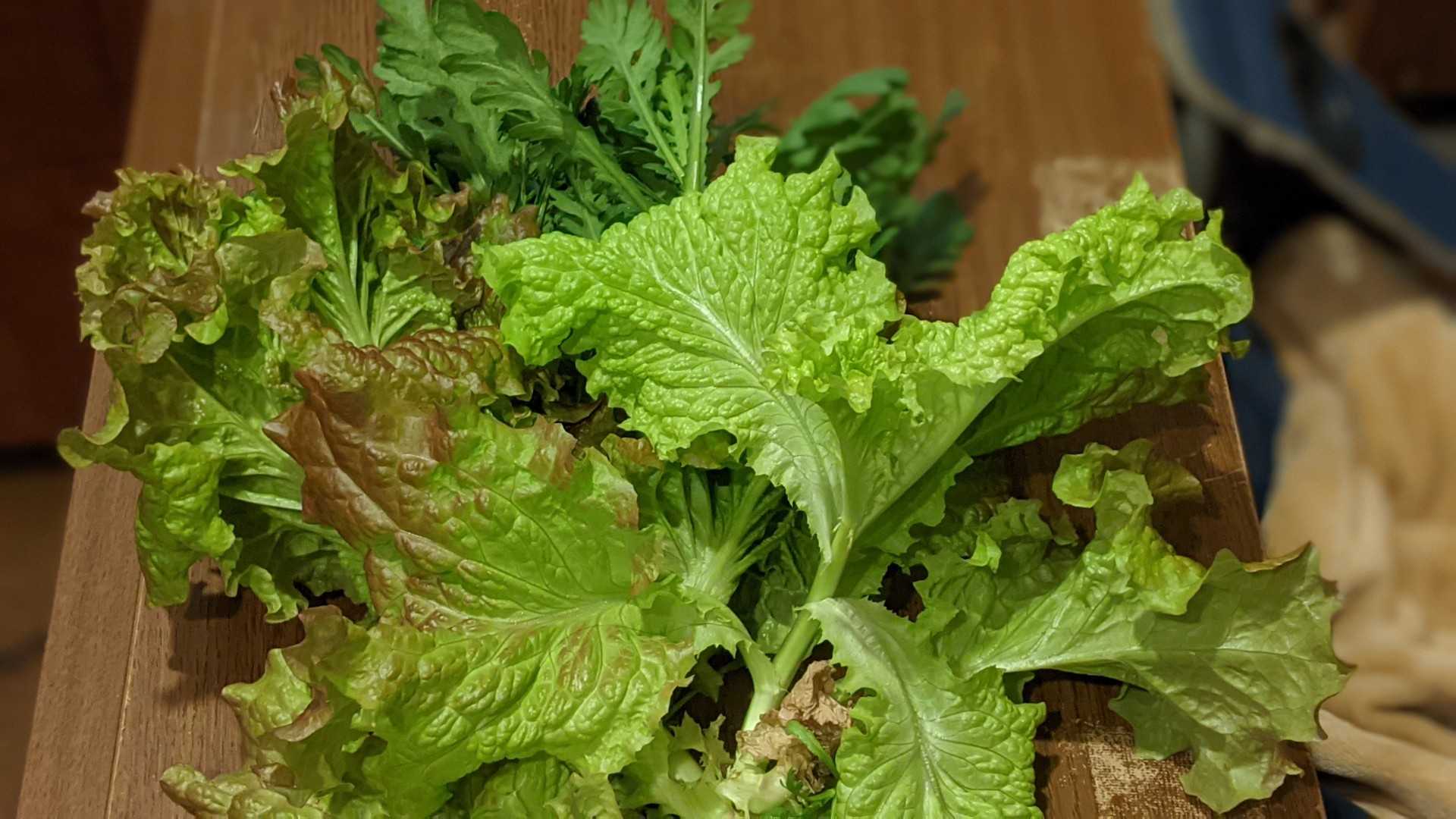 養液栽培で作っているレタスを摘みました。 レタス2本と春菊1本です。 レタスは鶏もも肉と炒めました。味付けは、乾燥エビを降り、醤油とゴマ油と炒りゴマに塩少々です。沢山あったレタスが、火を通したらすごく少なくなりました。 美味しかったです。 これを作ったので、植木鉢が一つ空きました。後3鉢くらい空きを作って、新しくレタスの栽培をしていきます。