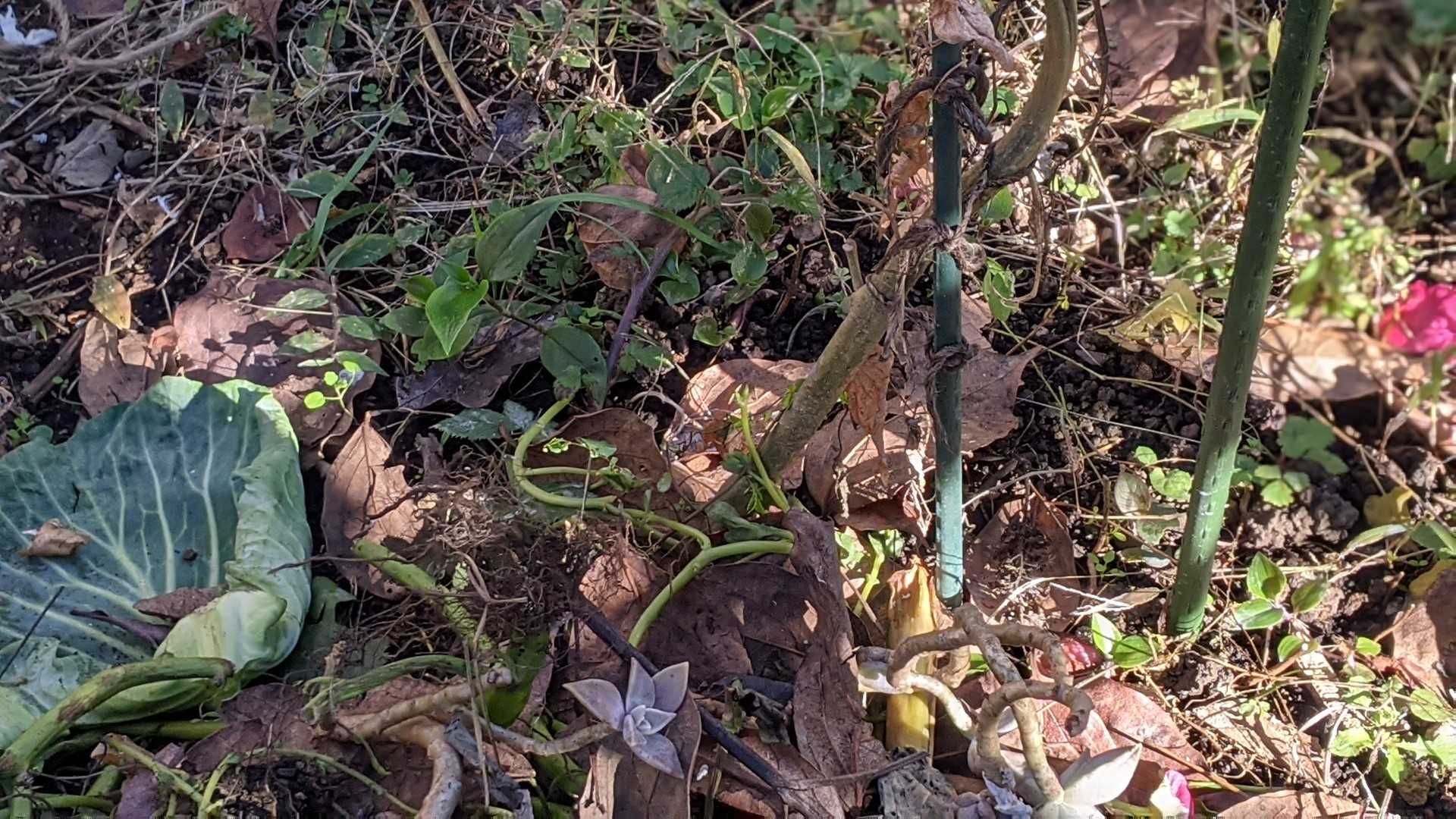 芽キャベツが、ネズミに食べられまして上の柔らかい部分の若い葉と芽をガッツリ食べるので、ドンドン苗が小さくなっていきます。この株は、これからもネズミに食べられて、勢いを取り戻すことはないと思いますので、栽培を終了します。葉を落としました。これは、シチューに入れて食べます。
