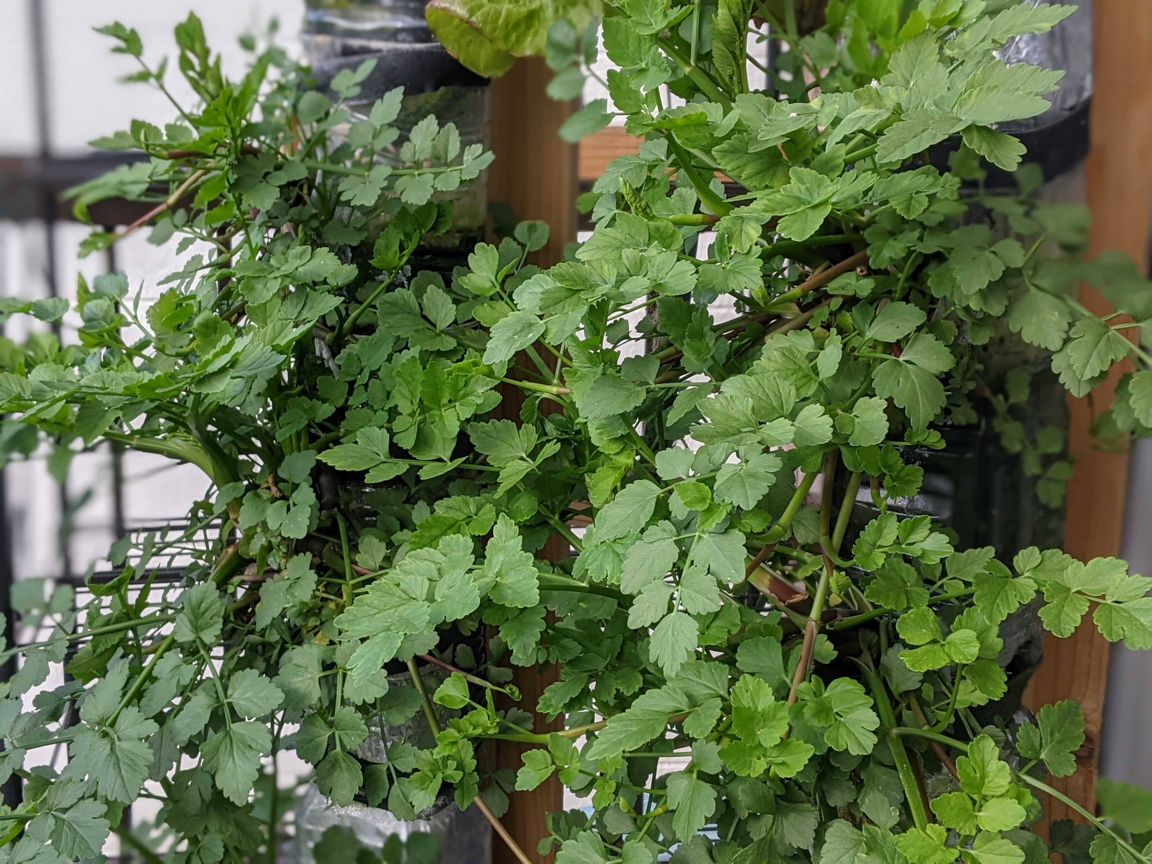ペットボトルを重ねてタワーにしているんですが、タワーの中はセリの根でつながっています。根が充実しているので、葉も茎もワサワサです。