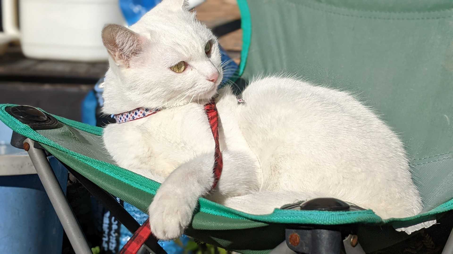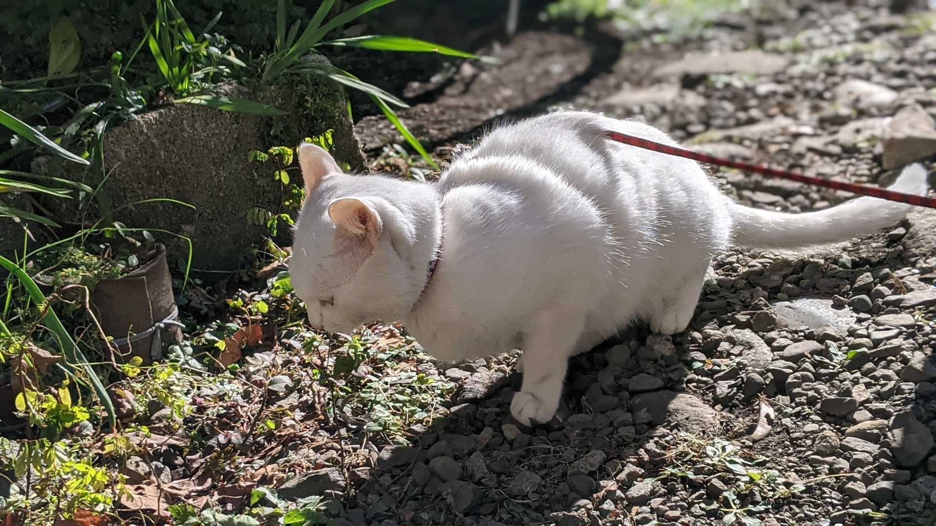 よく晴れていて、お洗濯日和です。こんな日には、私も庭仕事に精出せるし、一緒に猫も外に放牧します。